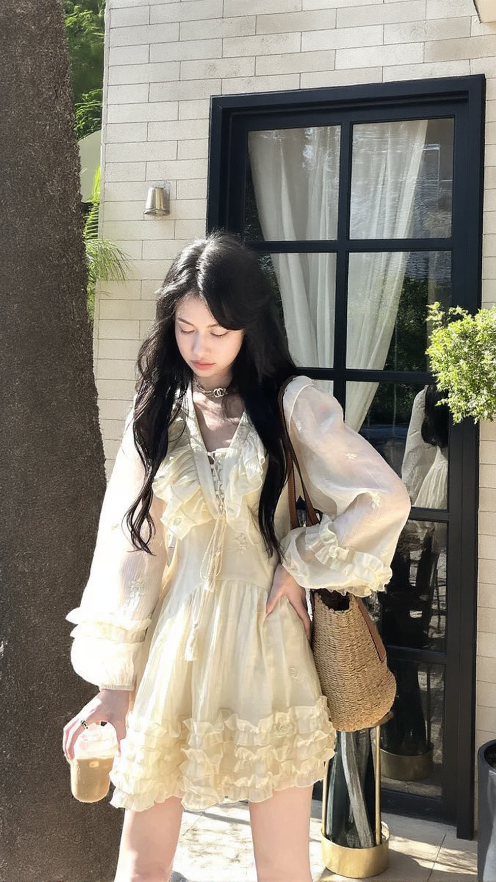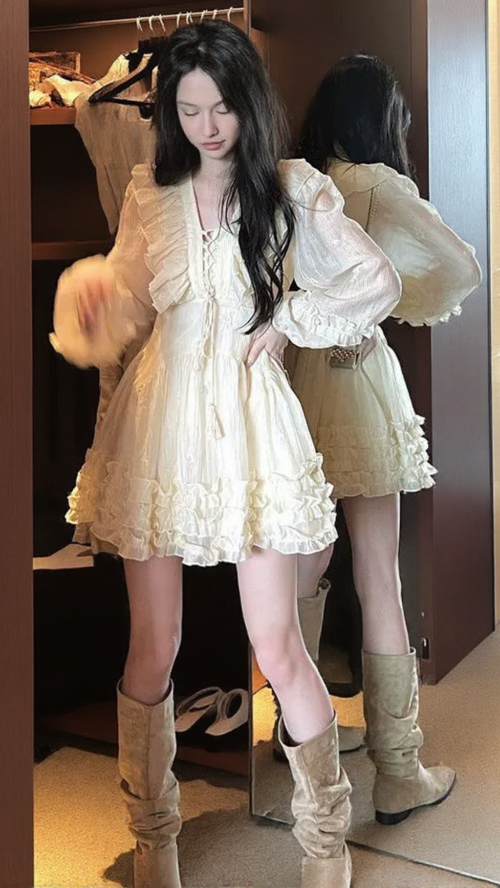 Add a touch of elegance with our ruffled long-sleeve mini dress. Made with luxurious embroidered fabric, this dress features a fringed drawstring neckline and three lace skirts, all in a beautiful champagne color. Experience comfort and style in one stunning piece.
