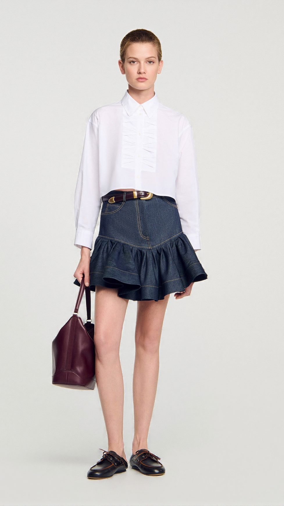 This deep blue ruffled mini denim skirt combines classic denim durability with a playful, feminine silhouette. Its ruffled hem adds movement and texture, making it a versatile piece for both casual and dressier occasions. Crafted for comfort and style, it pairs effortlessly with a variety of tops and footwear, offering a chic, expert-approved addition to your wardrobe.