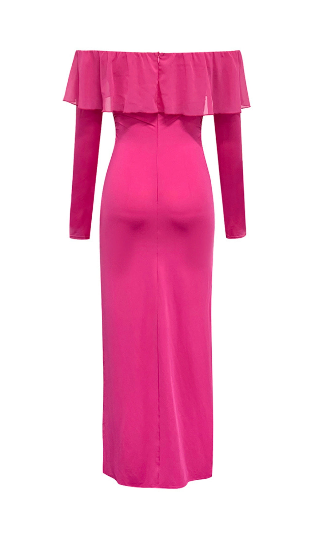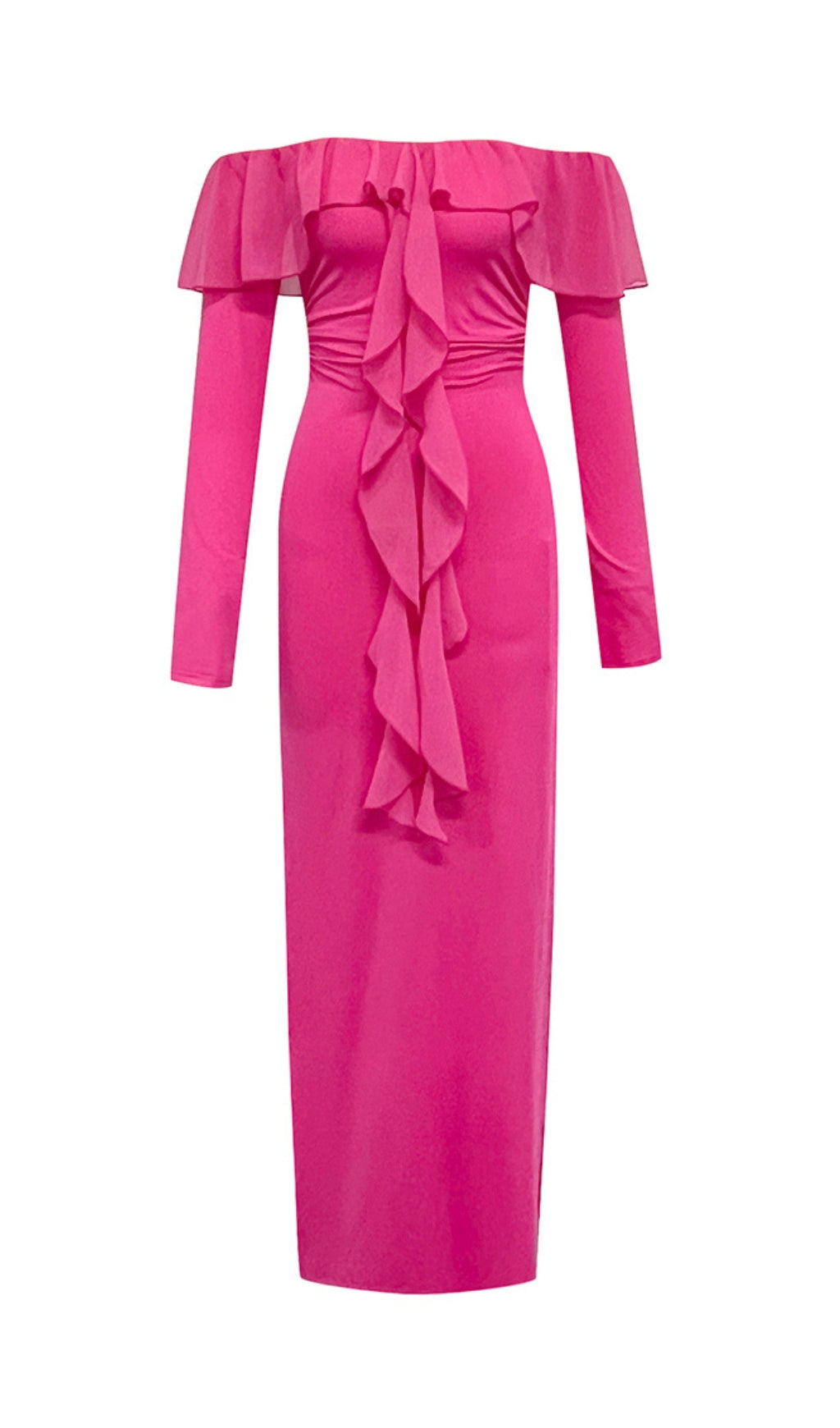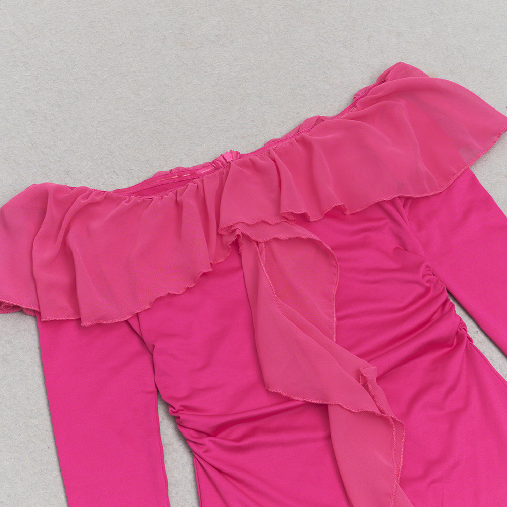 The ruffled neckline adds a touch of elegance, while the high slit adds a hint of sultriness. Perfect for any occasion, this dress will have you feeling confident and stylish.