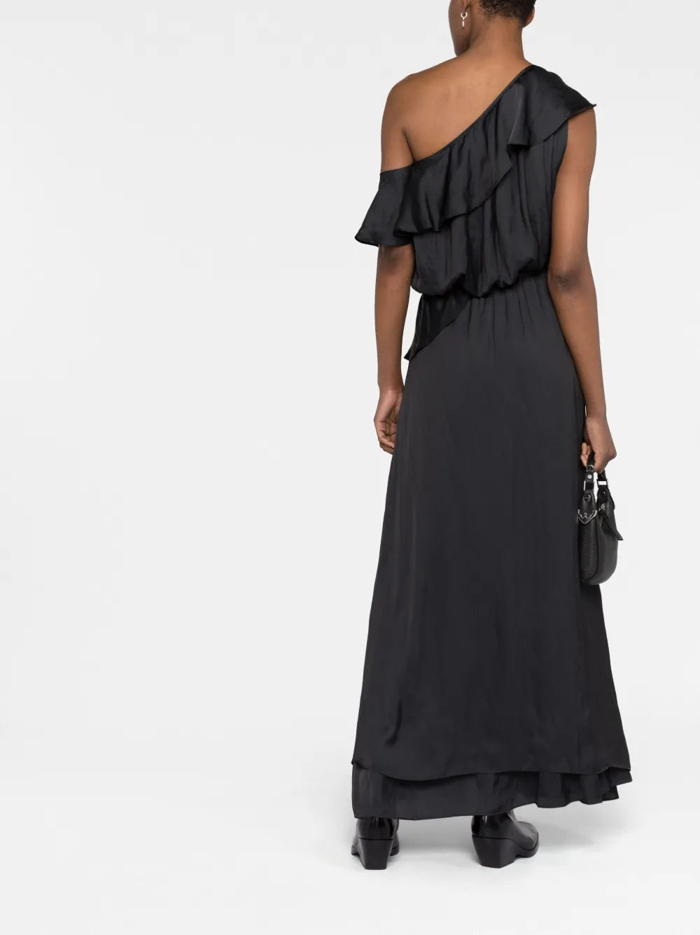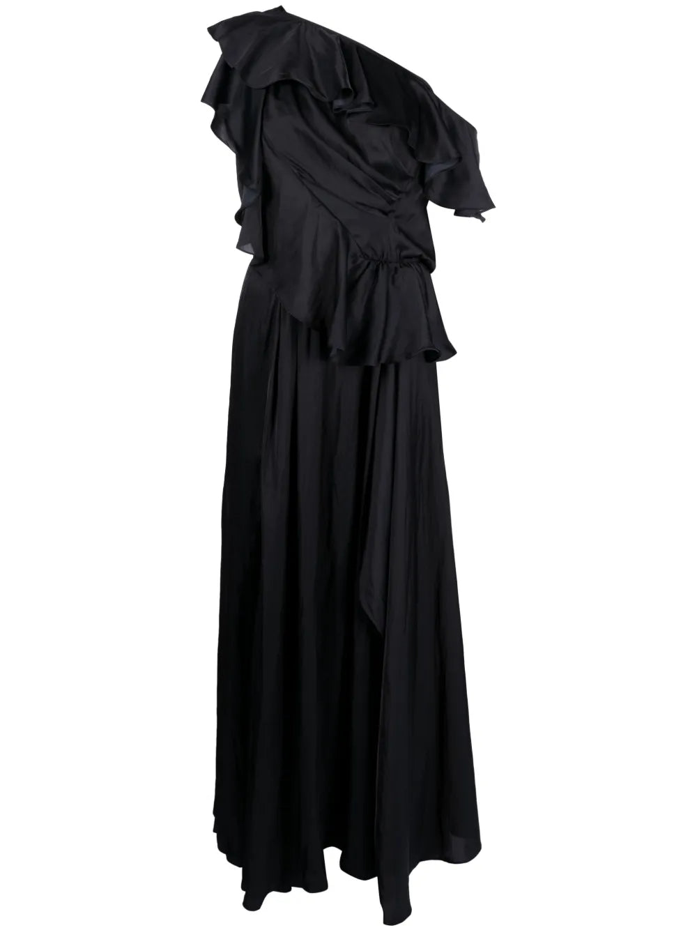 This black one-shoulder gown is adorned with delicate ruffle trim detailing for a flowy look.