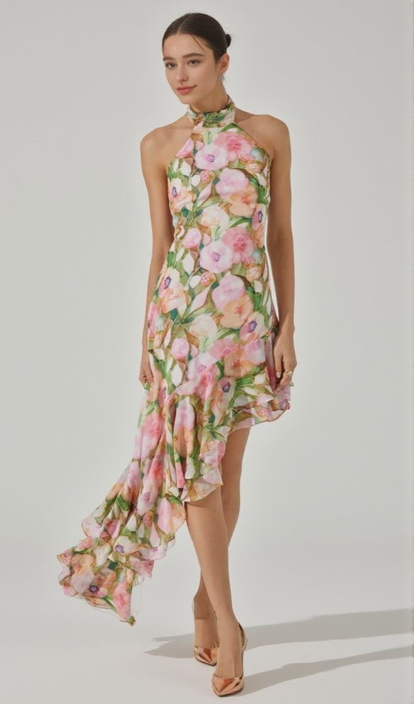 SABINA PINK GREEN ASYMMETRIC FLORAL HALTER MIDI DRESS