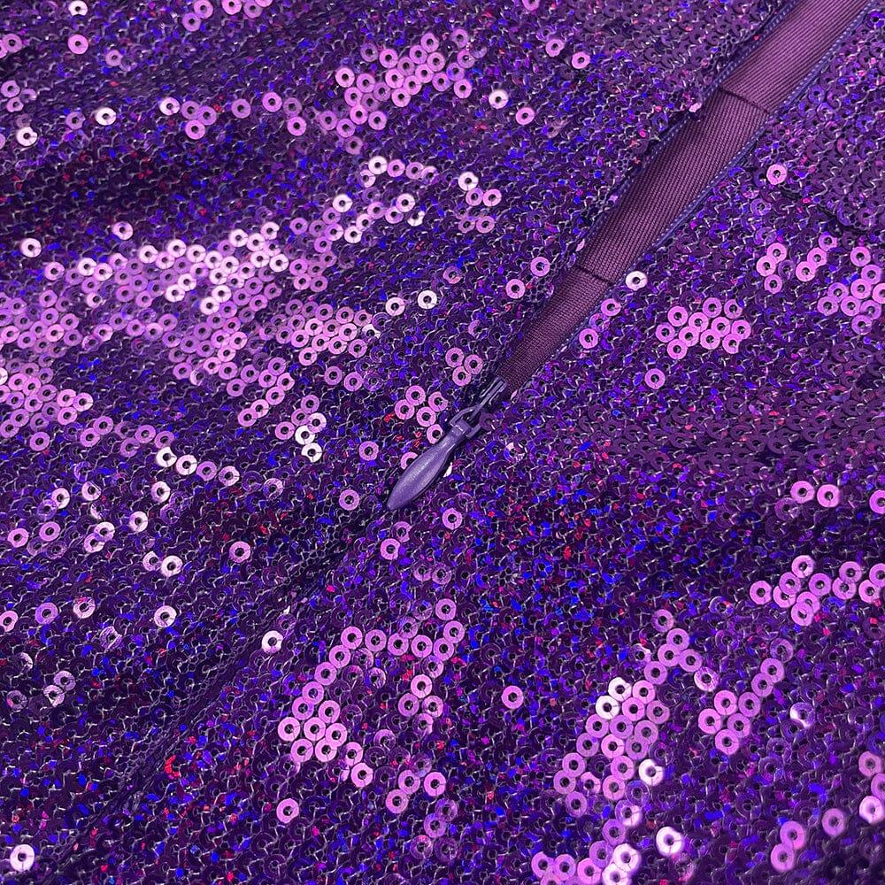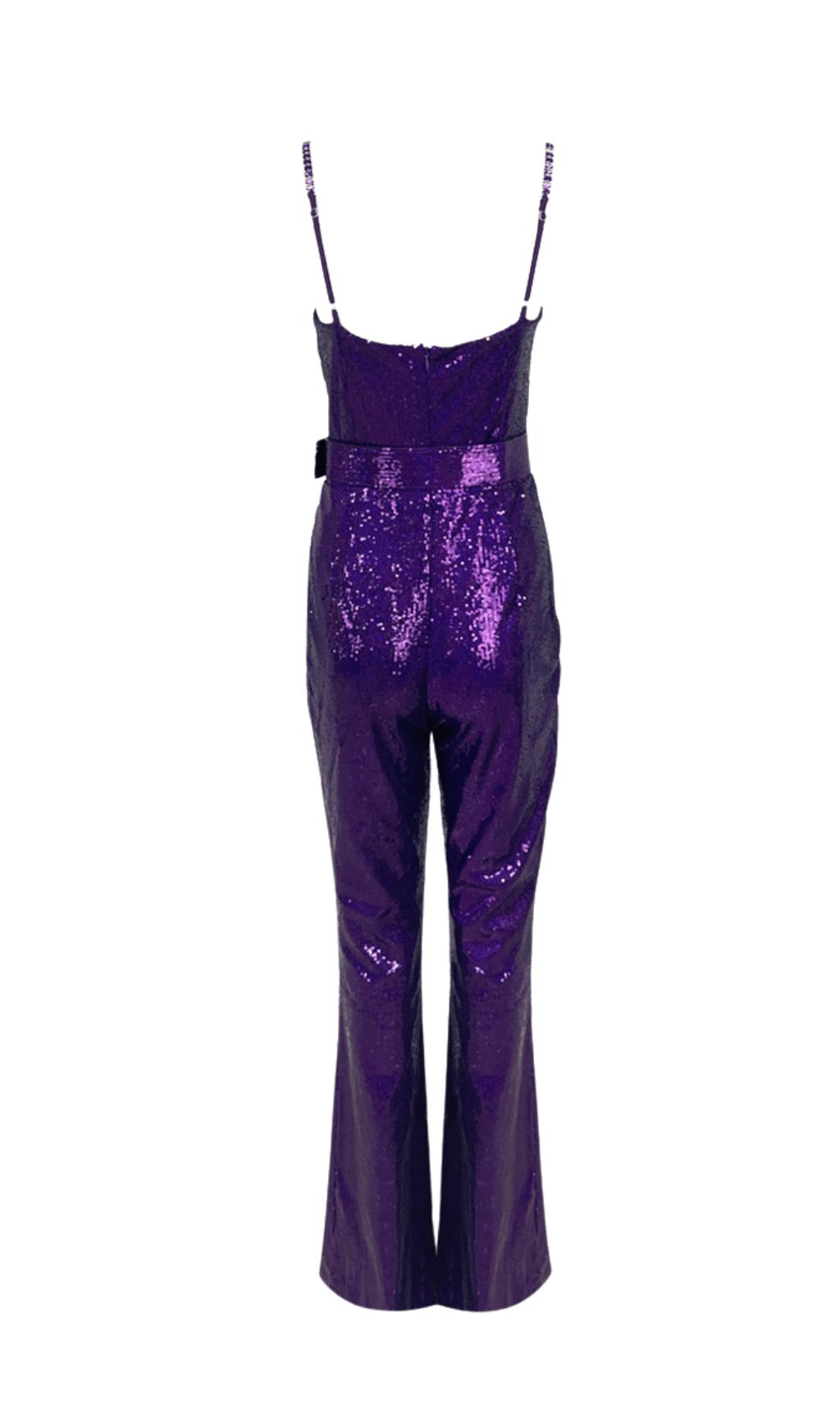 This figure-hugging jumpsuit is adorned with exclusively designed purple sequins and features adjustable straps, an underwire bust, and internal corset boning to provide both shape and support. The jumpsuit is finished with flared trousers, a concealed zip to the back, and is fully lined for a smooth and comfortable fit.