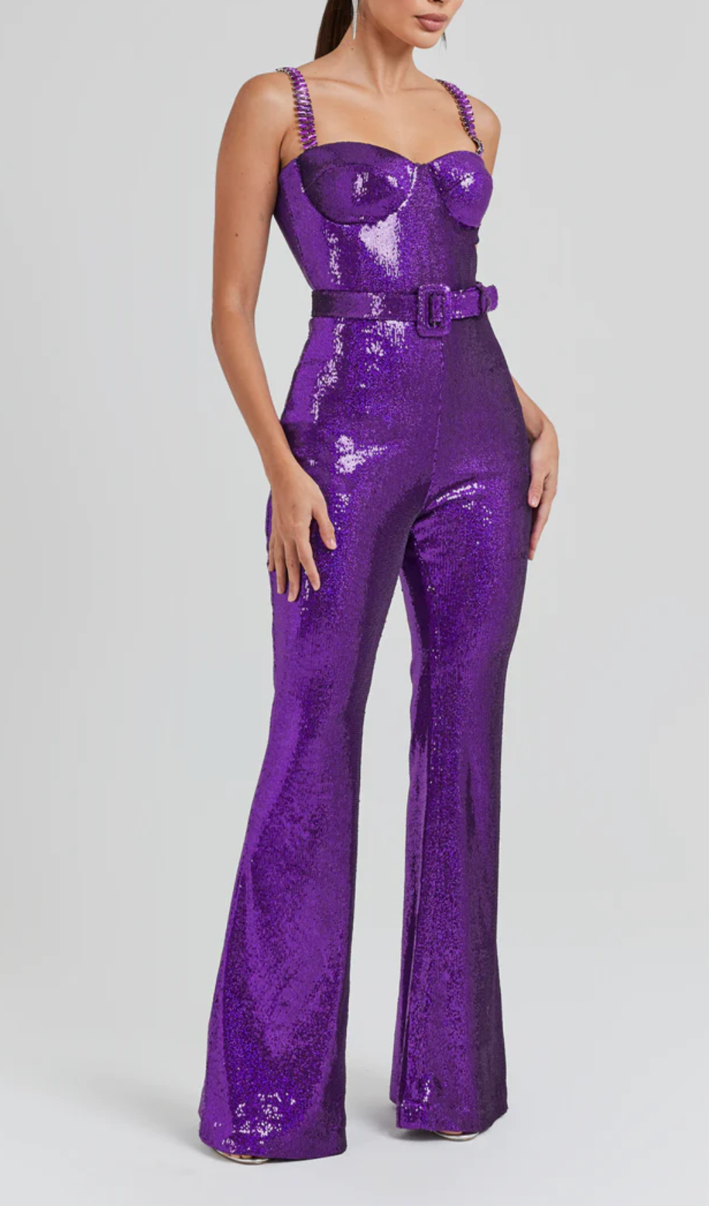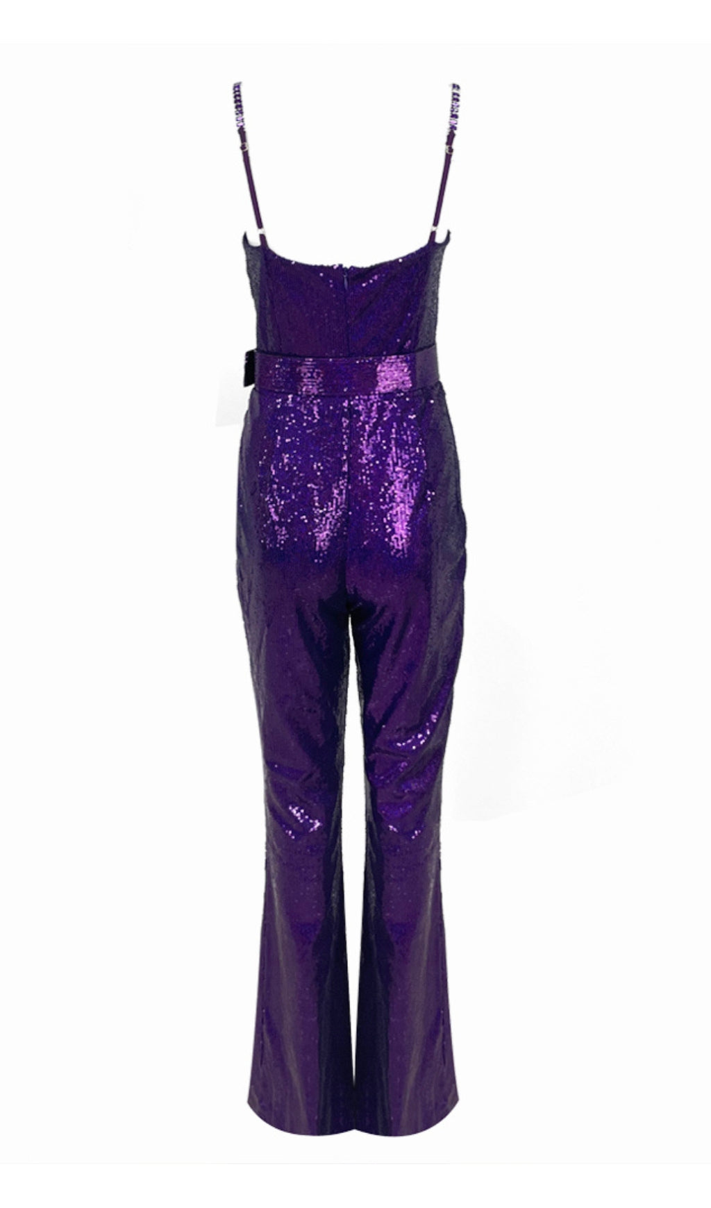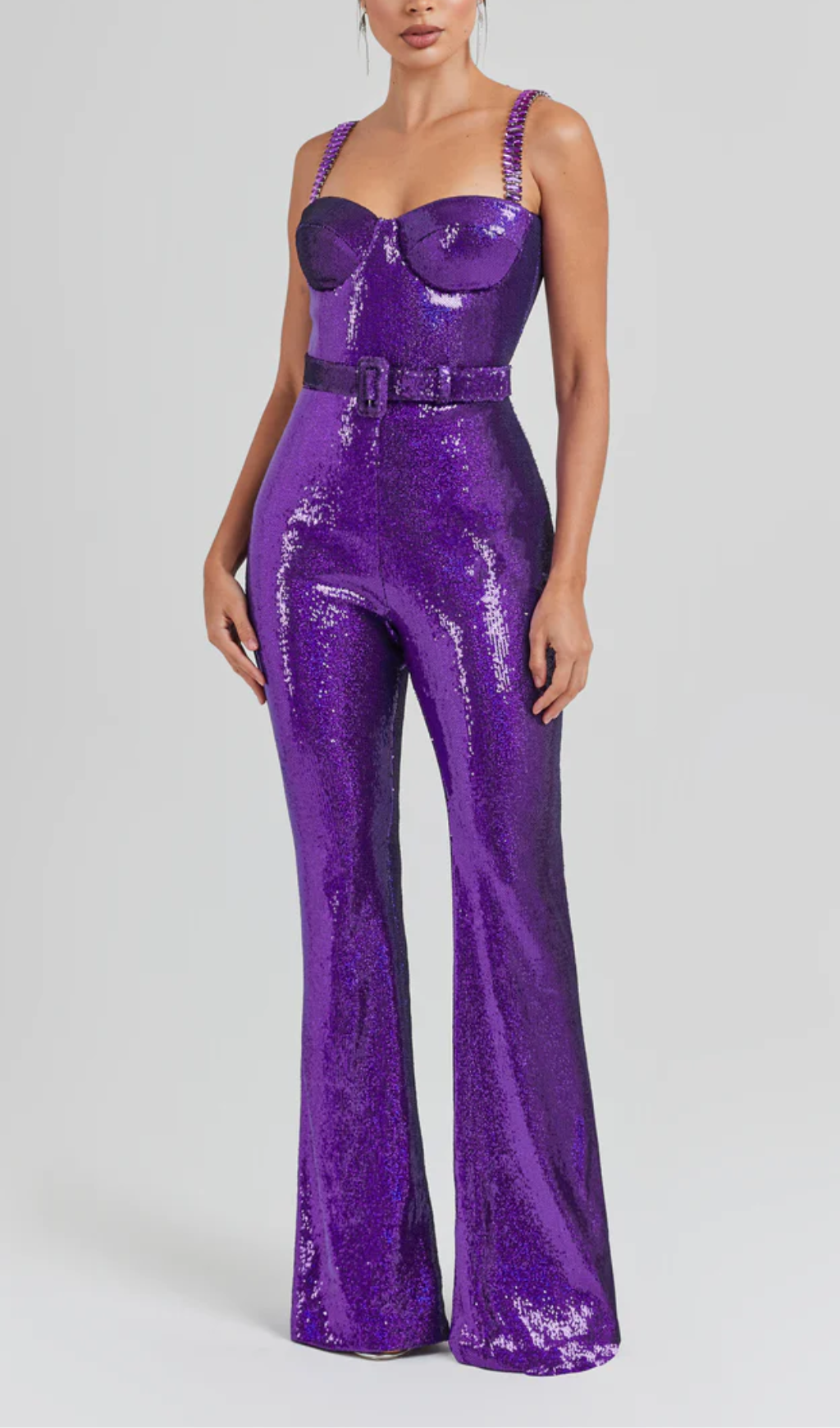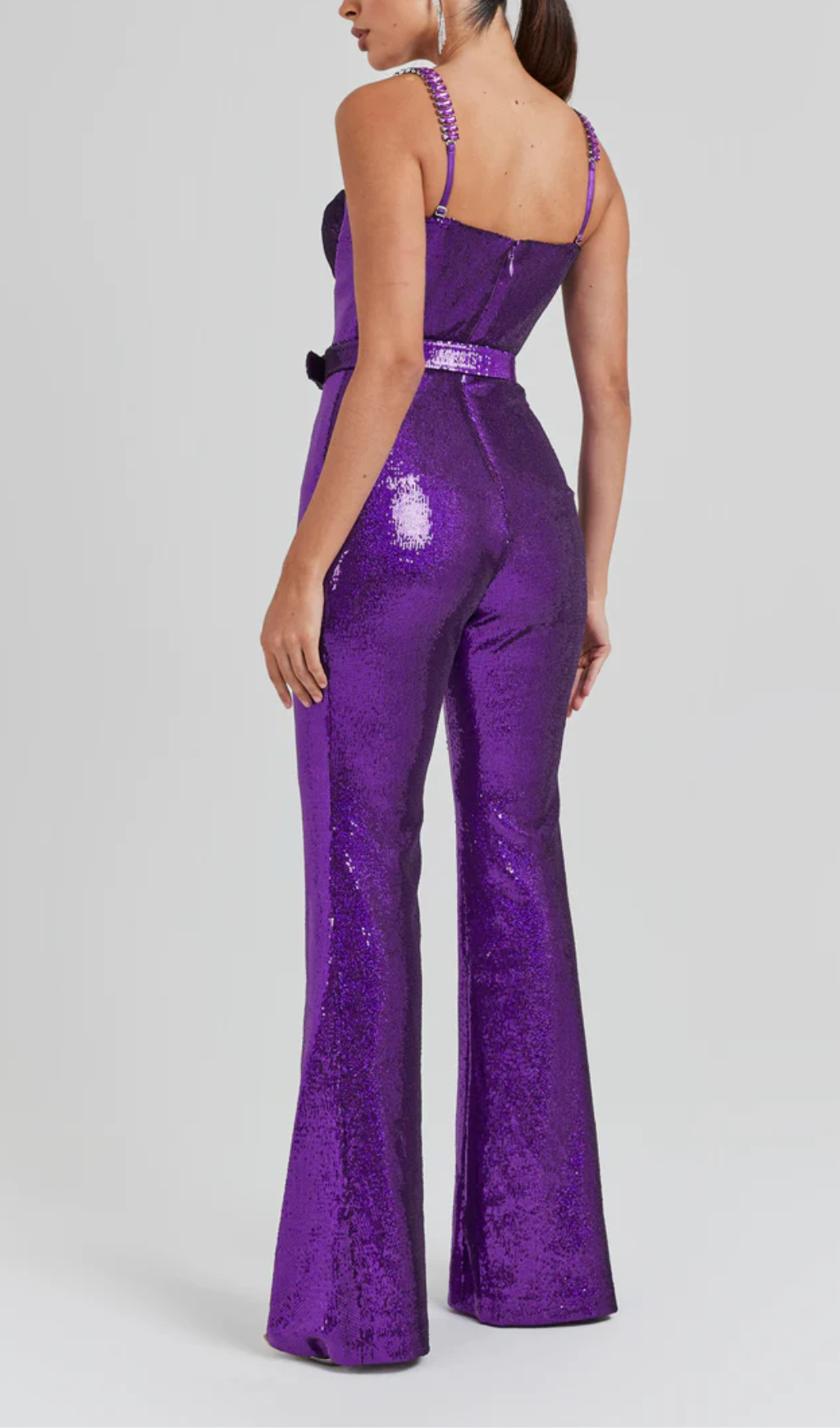 This figure-hugging jumpsuit is adorned with exclusively designed purple sequins and features adjustable straps, an underwire bust, and internal corset boning to provide both shape and support. The jumpsuit is finished with flared trousers, a concealed zip to the back, and is fully lined for a smooth and comfortable fit.