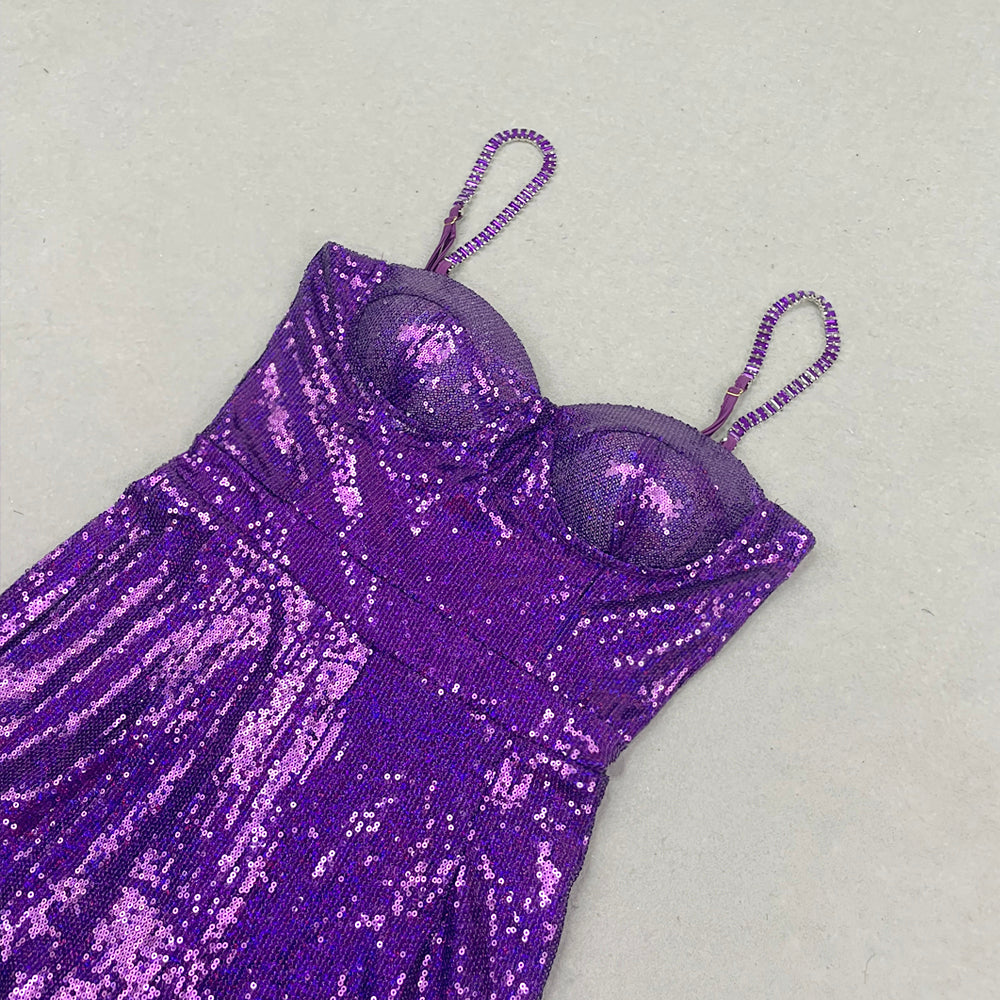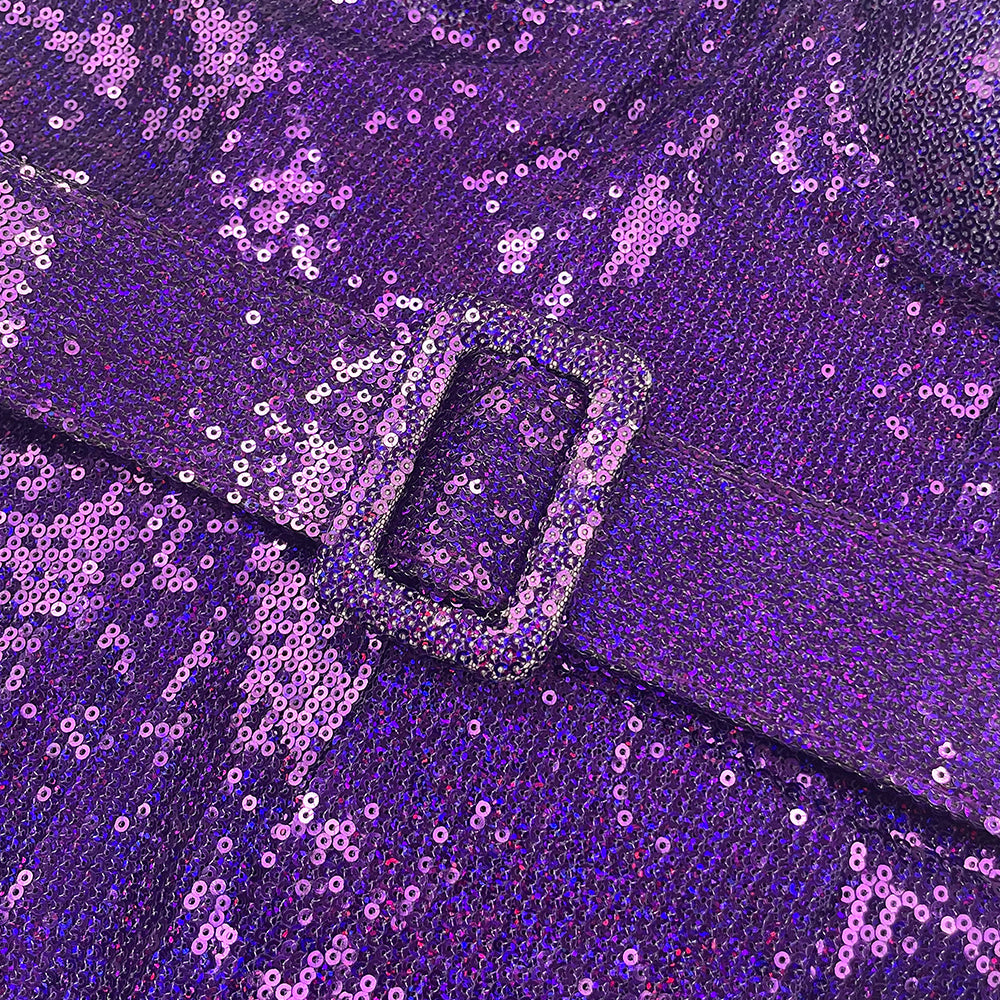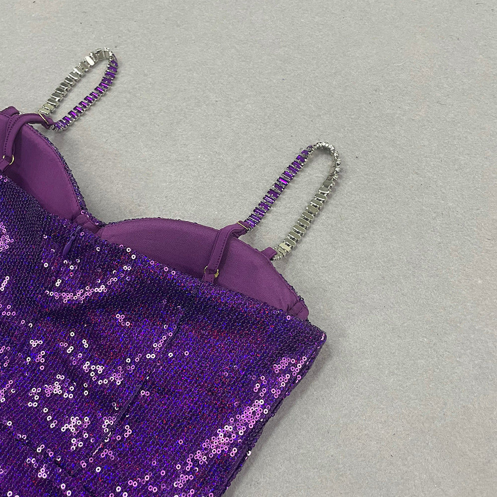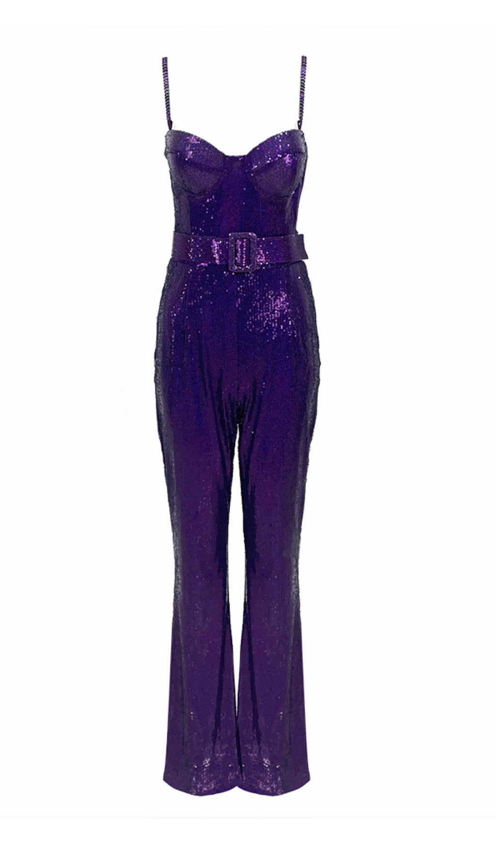 This figure-hugging jumpsuit is adorned with exclusively designed purple sequins and features adjustable straps, an underwire bust, and internal corset boning to provide both shape and support. The jumpsuit is finished with flared trousers, a concealed zip to the back, and is fully lined for a smooth and comfortable fit.