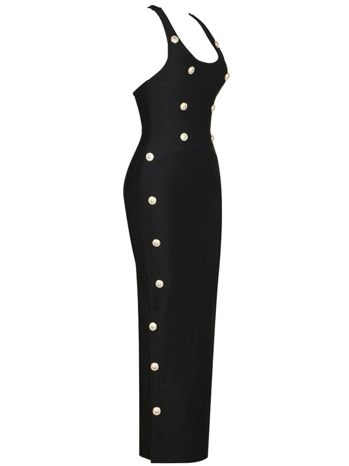Be stately and elegant with the Sadie Button Embellished Bandage Dress. Its bandage fabric is designed to hug all your curves while the subtle split adds femininity and extra movement. Complete with a maxi length, bring a touch of sophistication to any special occasion.