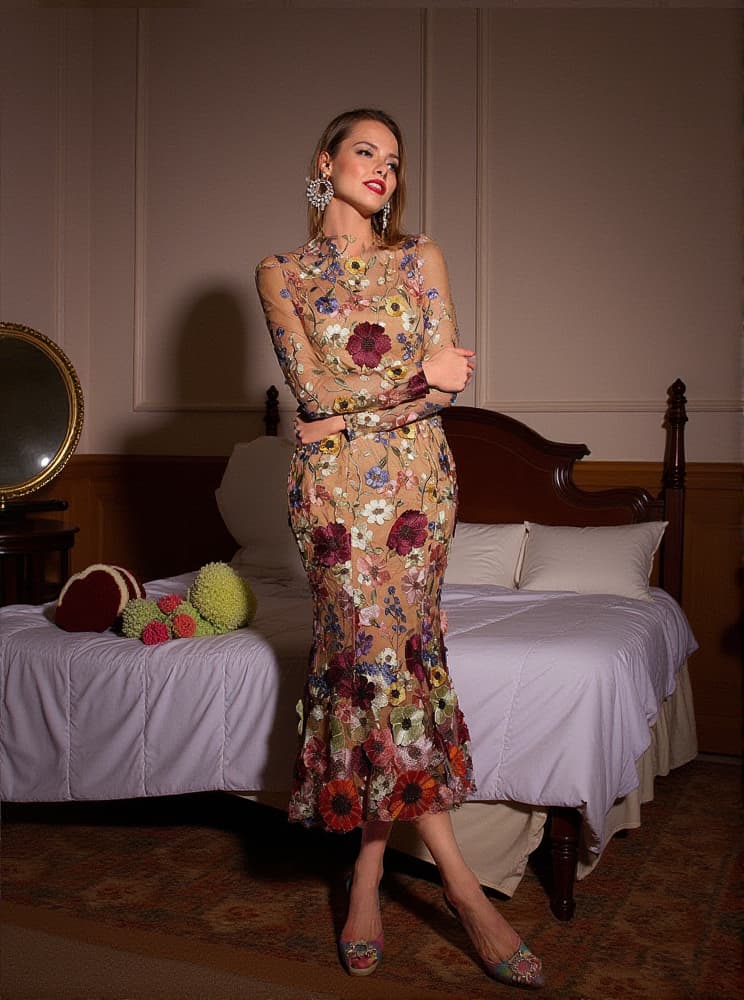 Saige Long Sleeve Mesh Flower Mermaid Dress In Blush