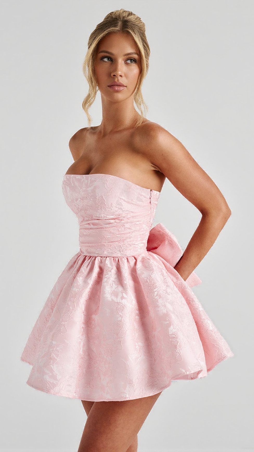 The Salome Mini Dress in Blush is a romantic and chic choice for any special occasion. Crafted from premium floral jacquard fabric, this strapless mini features an elegant pleated bodice with lace up back that cinches at the waist, enhancing the feminine silhouette. Internal boning provides structure and support, while the voluminous full skirt creates a beautiful, flouncy look. A detachable bow at the back adds a charming detail. Whether you're attending a garden party or a cocktail event, this dress is the perfect blend of elegance and and style.