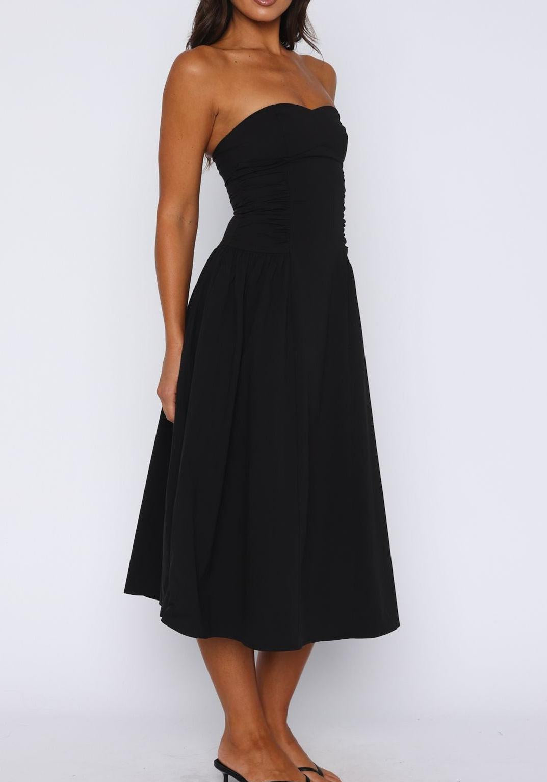 The Sandra Strapless Midi Dress in black offers a sleek, timeless silhouette perfect for formal events or elegant evenings. Its strapless design highlights the shoulders and neckline, while the midi length provides a balanced, sophisticated look. Crafted to ensure a comfortable fit, this dress pairs effortlessly with heels and statement accessories for a refined, expert style.