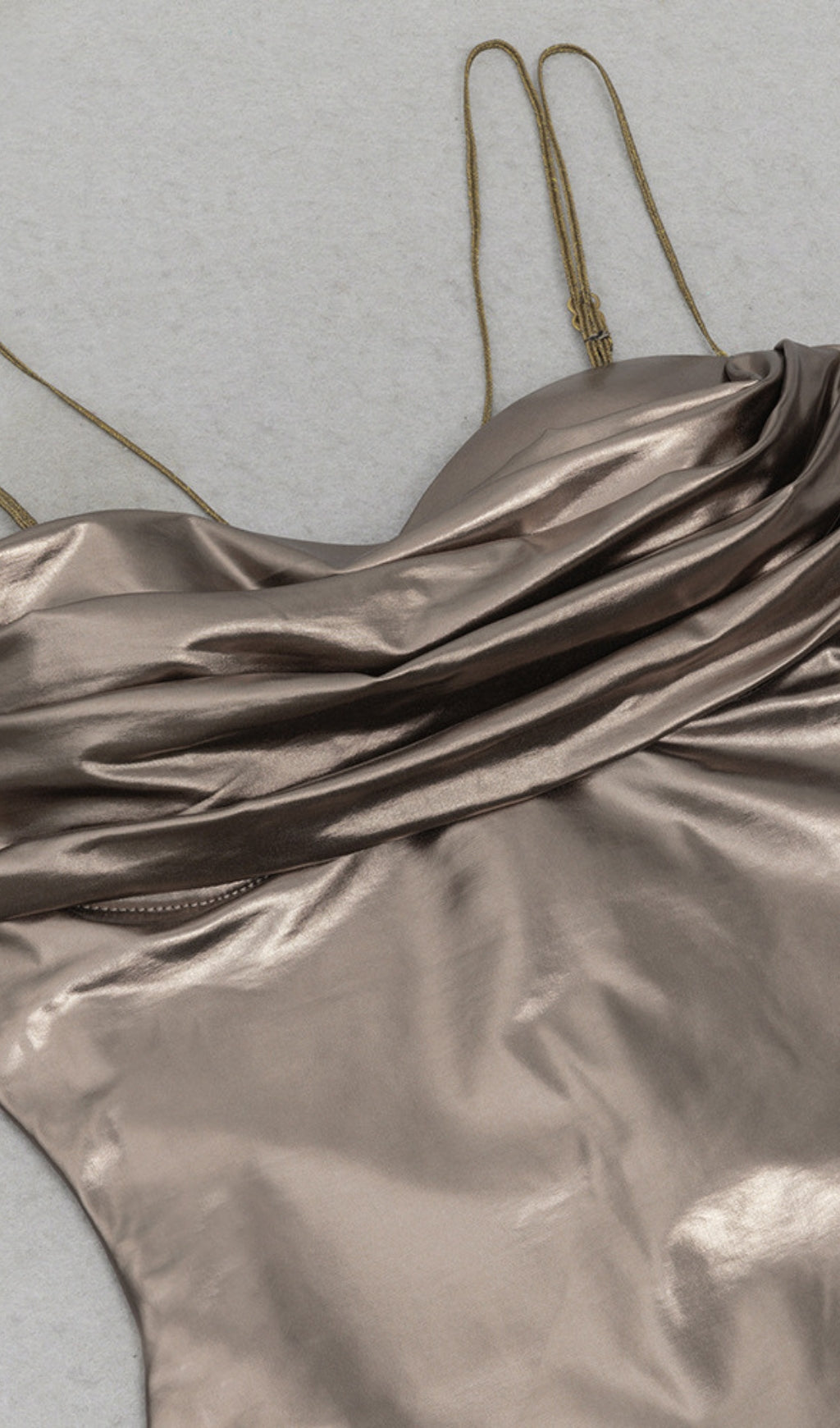 This dress features bronze satin fabric, a cowl - neckline, and delicate straps. The sleek, body - hugging design exudes elegance. Ideal for ��holiday break dress to impress�� gatherings, as ��hoco dress inspo�� for homecoming, or a ��celebrity event dress to impress�� occasion. Its refined, glamorous style lets you ��dress to impress�� with confidence, perfect for formal events, dinners, or special outings to stand out.