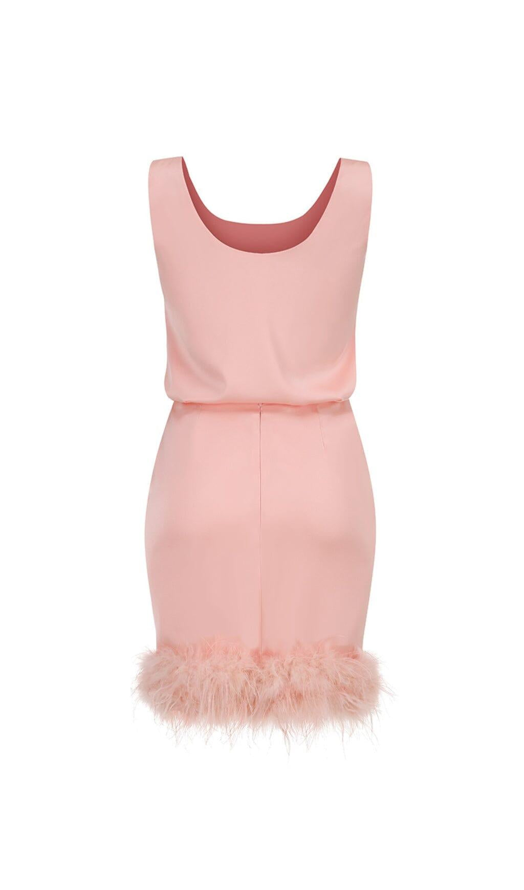 Elevate your style with our Satin Matching Set Mini Dress in Pink Diamond. This stunning dress combines a simple sleeveless vest with satin and a matte elastic woven skirt, adorned with beautiful Ostrich feathers in the same color. It's the perfect choice for those looking for an elegant and sophisticated look.