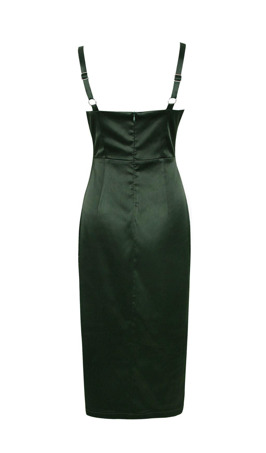 SATIN MIDI DRESS IN BLACKISH GREEN