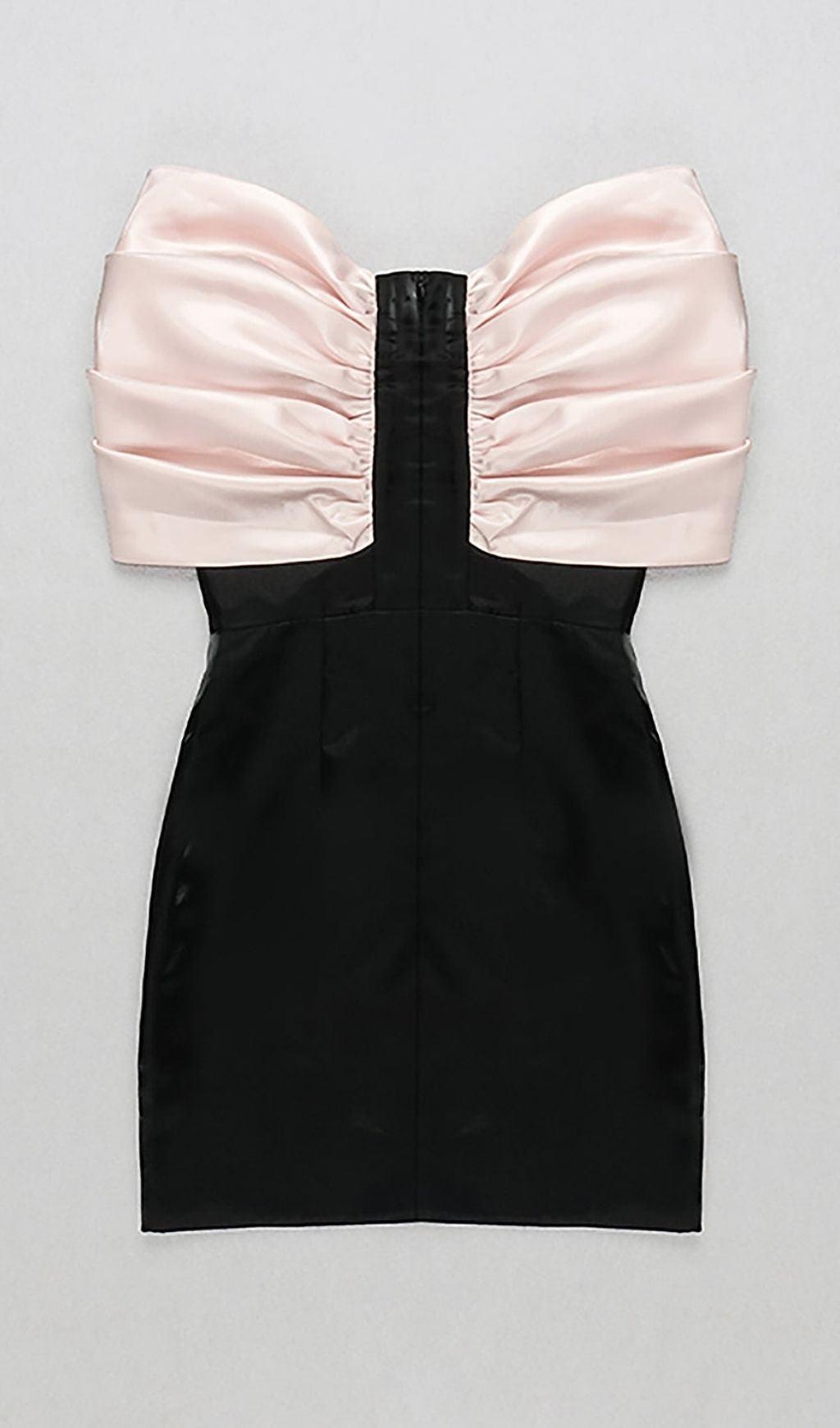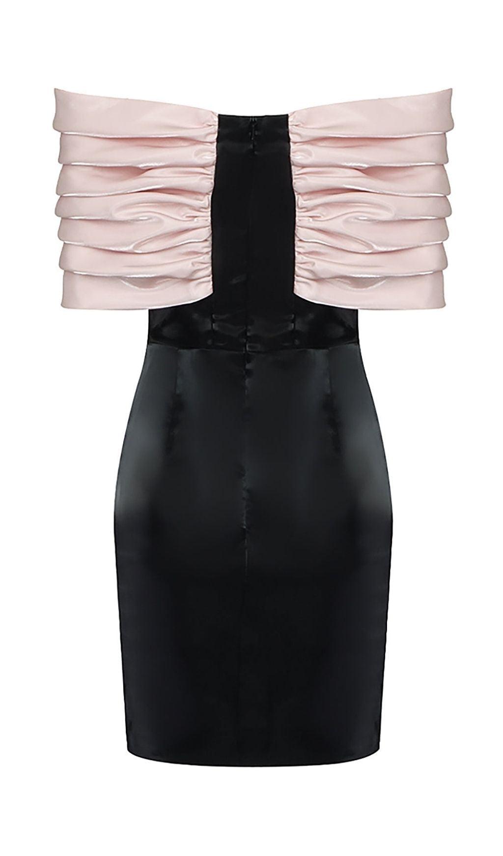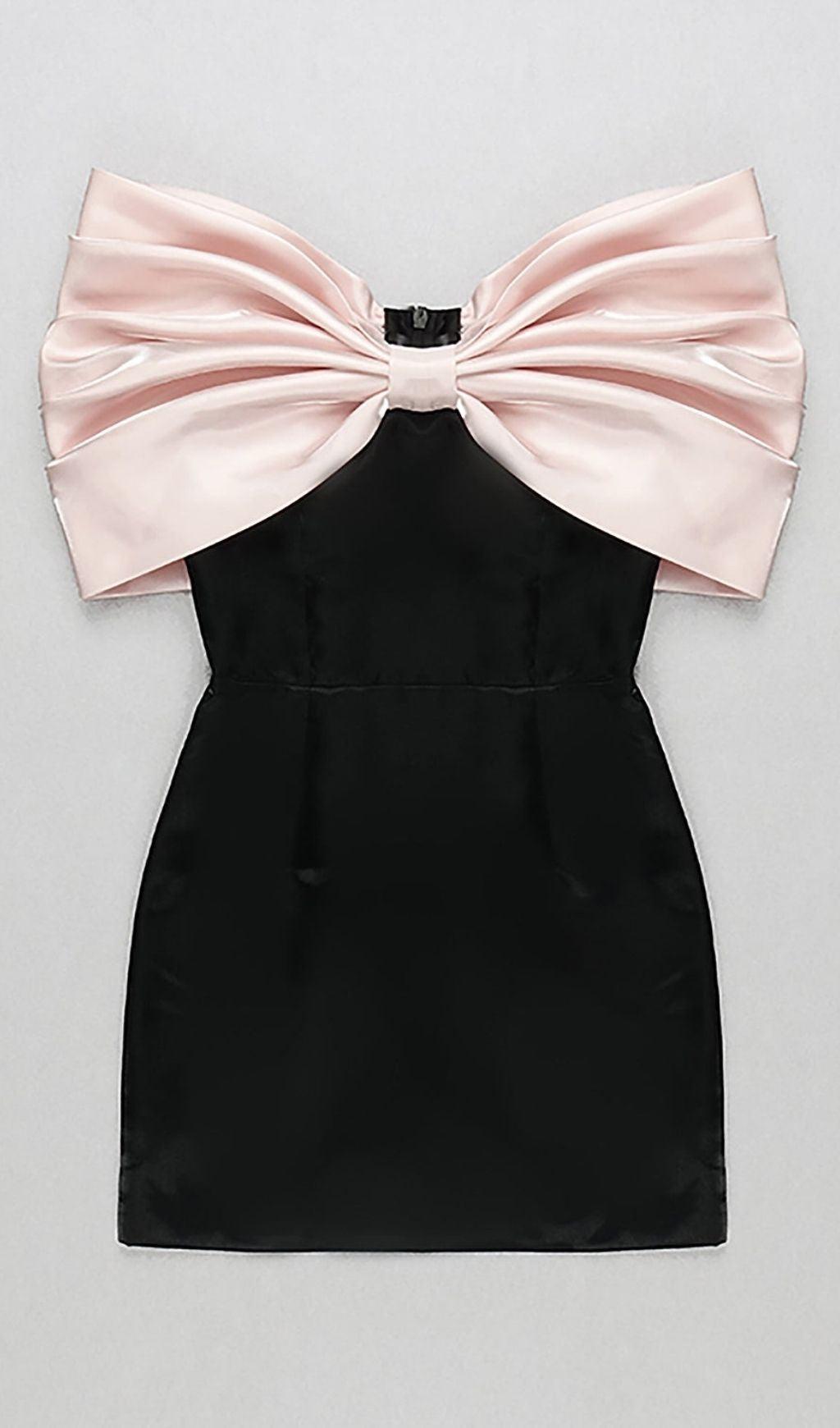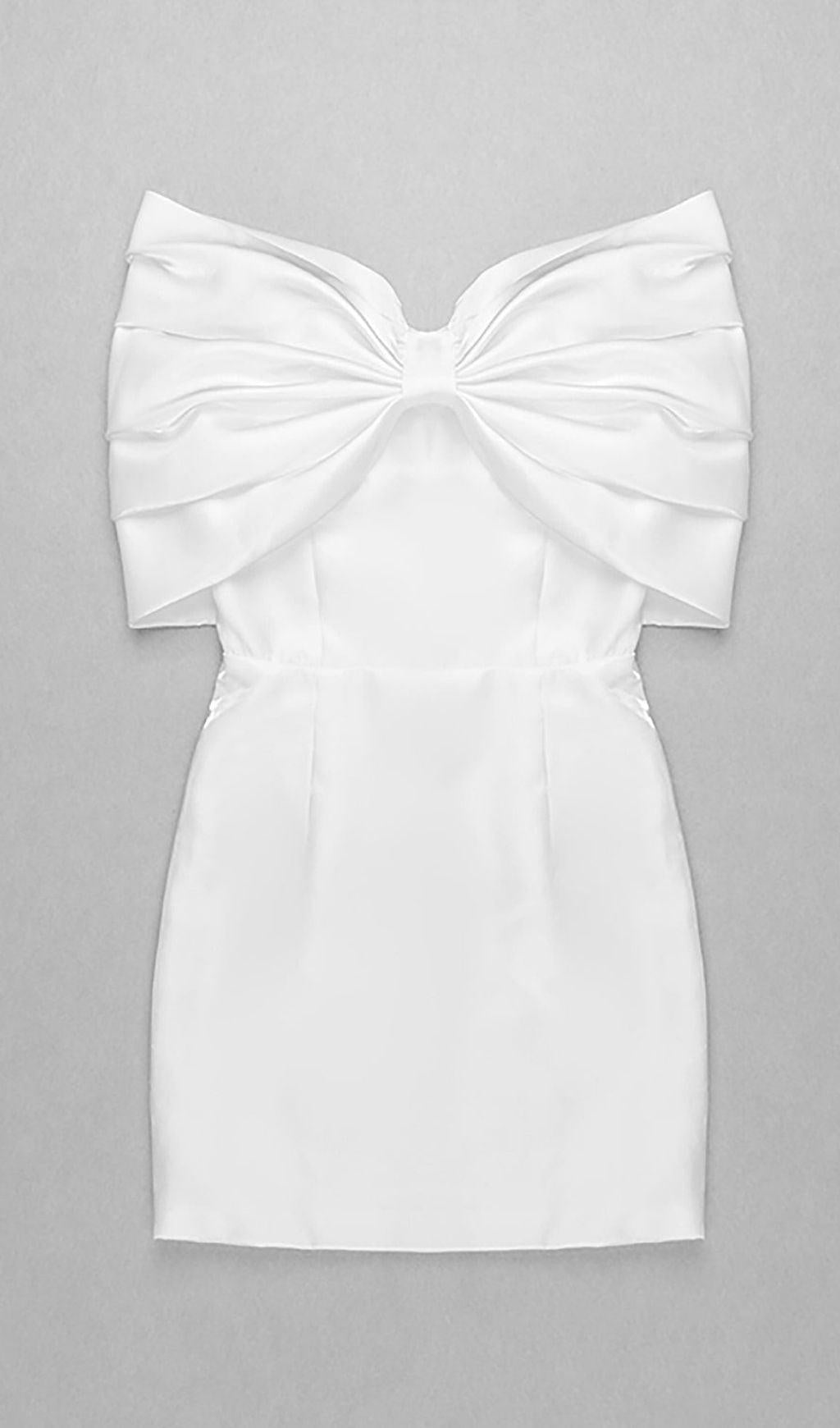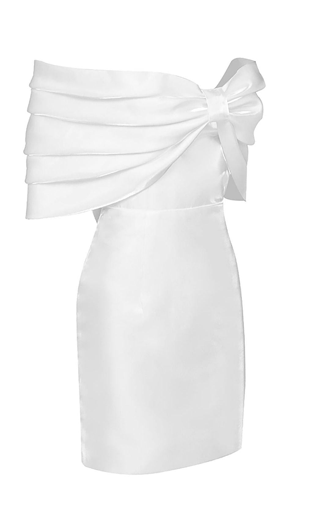 SATIN PINK BOW OFF SHOULDER MINI DRESS IN WHITE