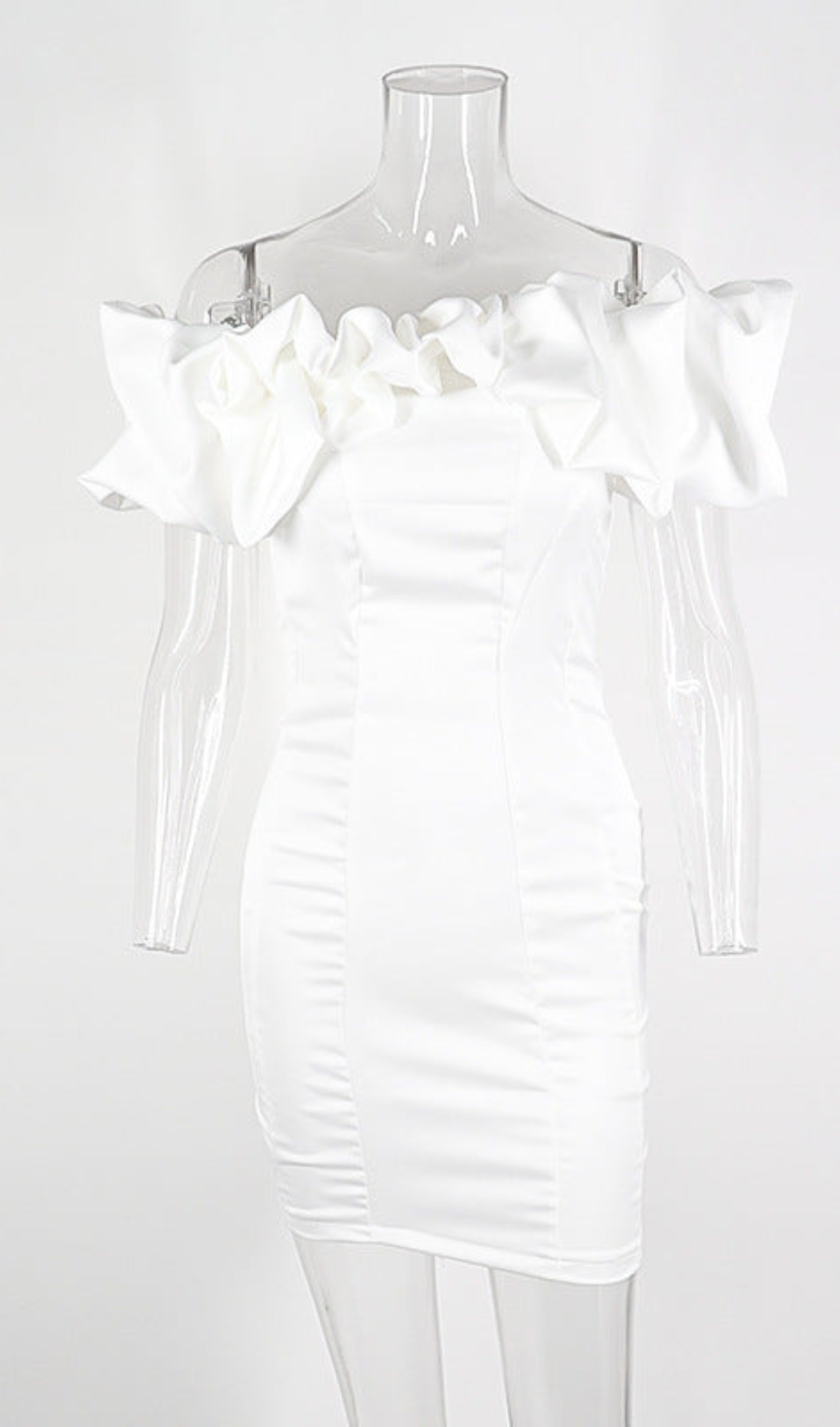 SATIN RUFFLE STRAPLESS DRESS IN WHITE