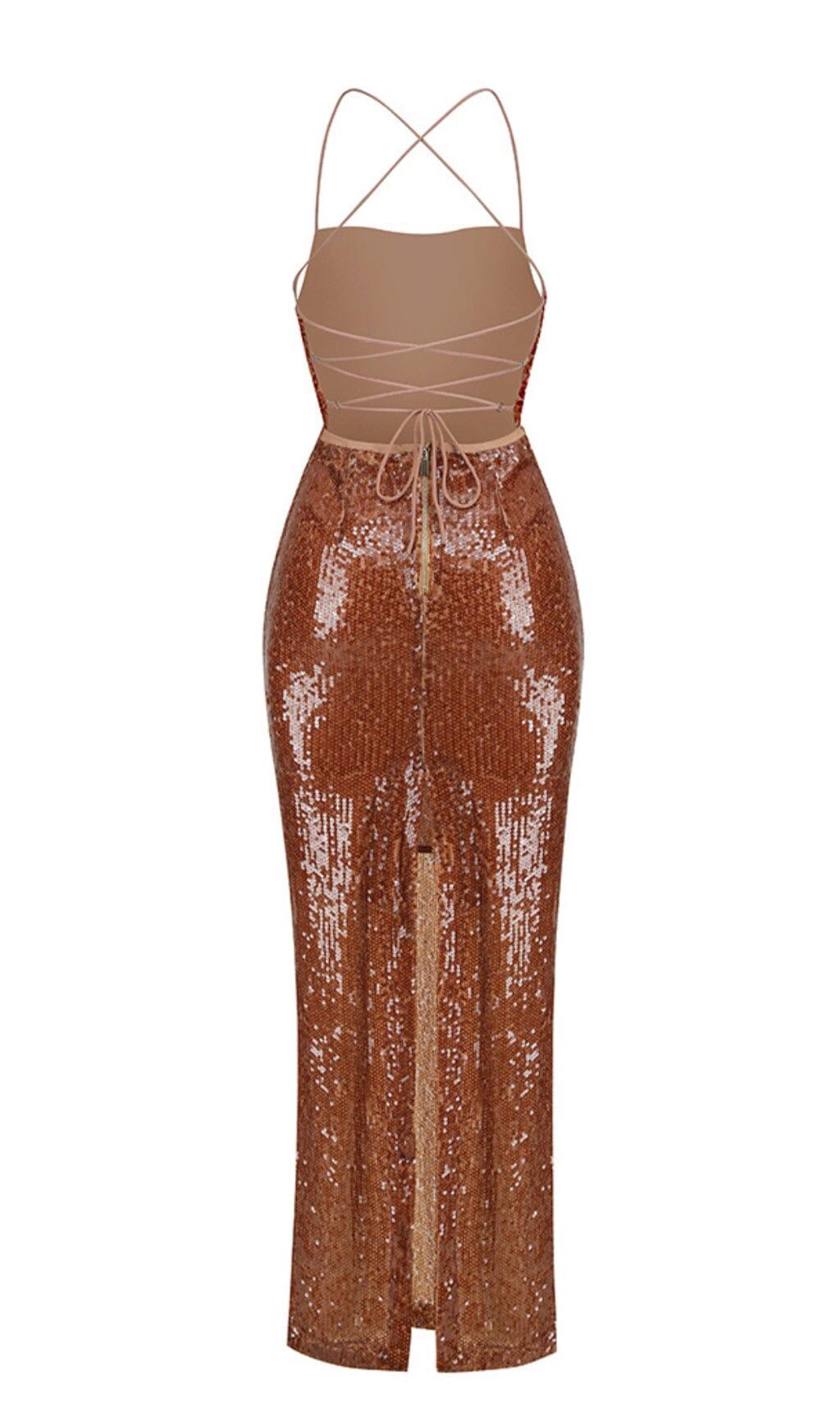 SEQUIN BACKLESS MAXI DRESS IN BROWN