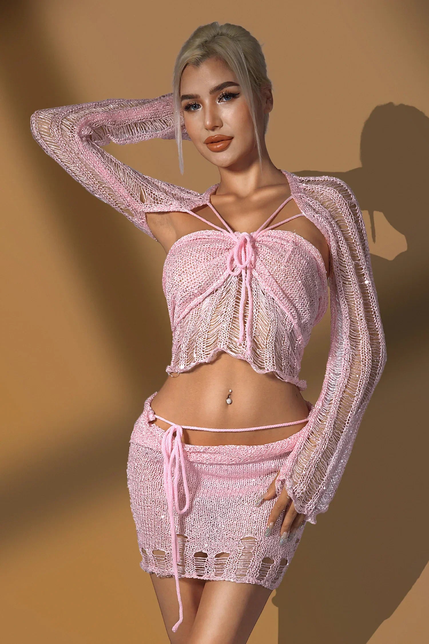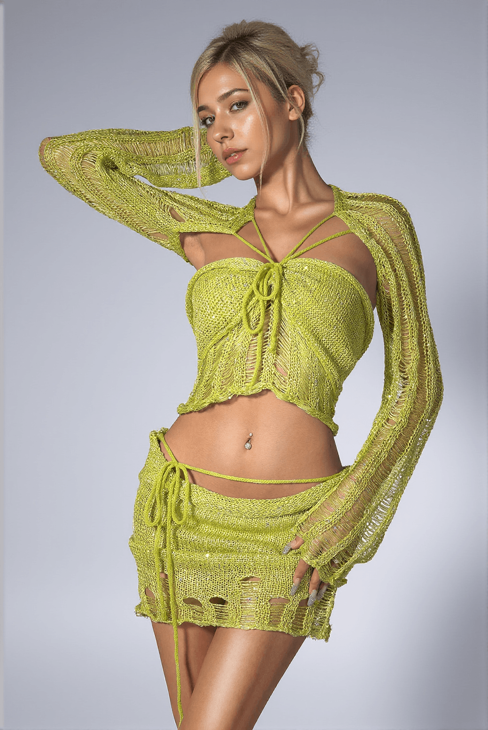Step into the spotlight with our exquisite Women's Sequined Knitted Bra, Lace-Up Long-Sleeve Cardigan, and Matching Skirt Set. This chic ensemble is designed to turn heads at any event or evening out, offering a blend of elegance and trendiness.