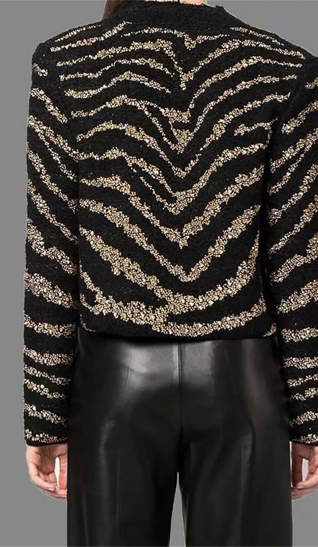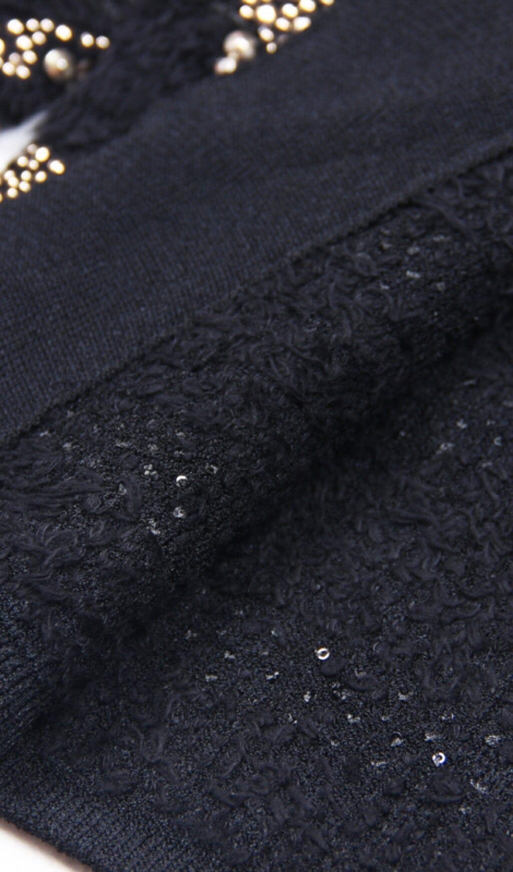 Choose this sequin-embellished knitted two-piece set in white and get ready to turn heads wherever you go. With its glamorous design, stylish bralette top, elongating knit pants, and unforgettable allure, this outfit is perfect for those who want to make a statement and feel like a shining star.