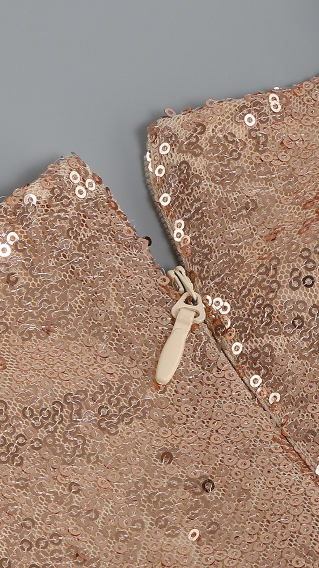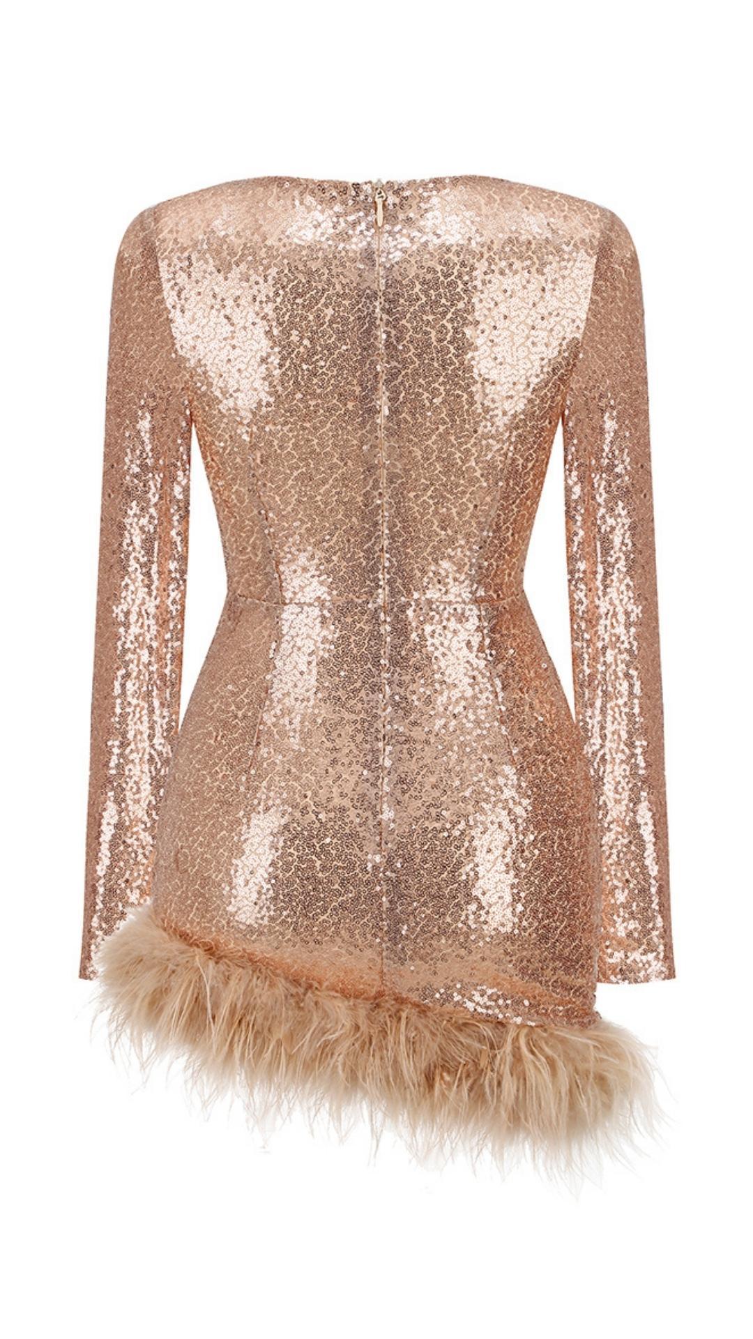 SEQUIN FEATHER MINI DRESS IN ROSE GOLD