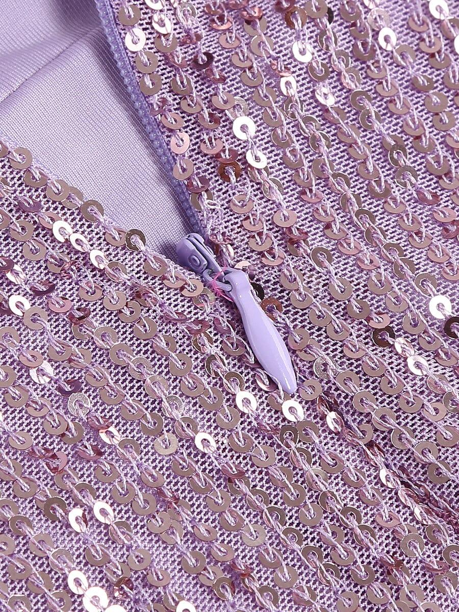 SEQUIN FEATHER STRAPLESS MINI DRESS IN PURPLE