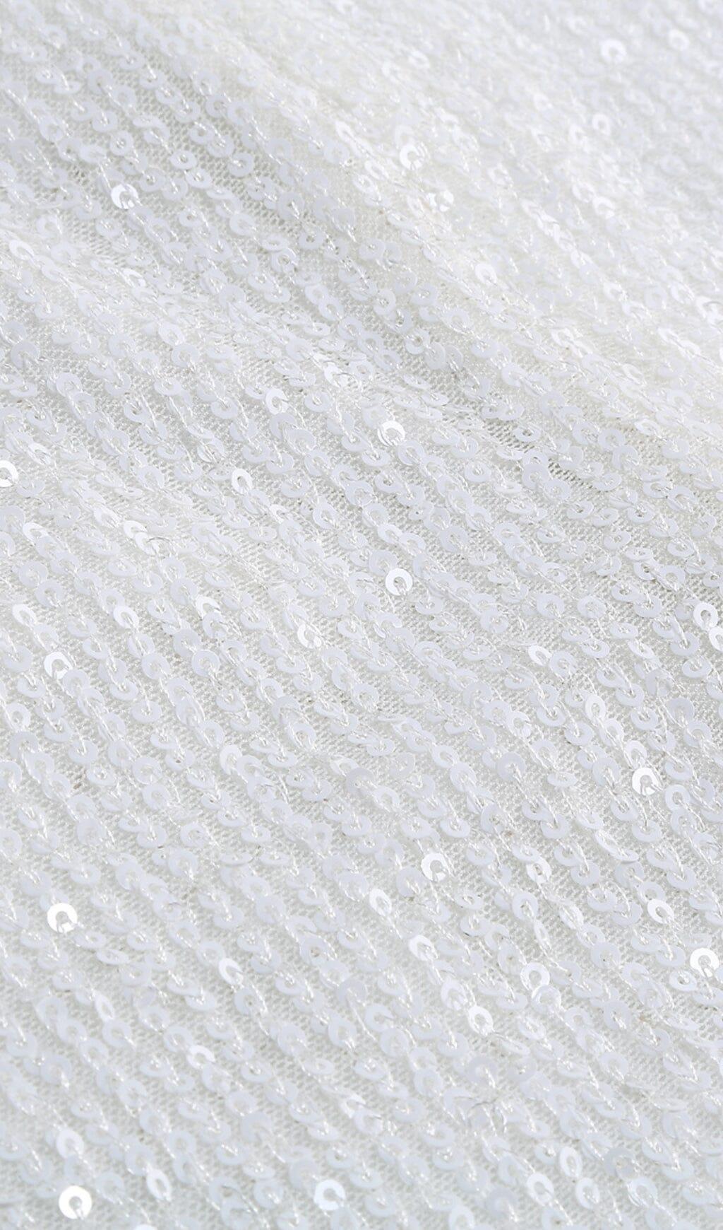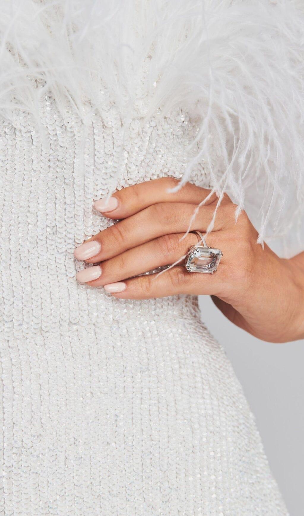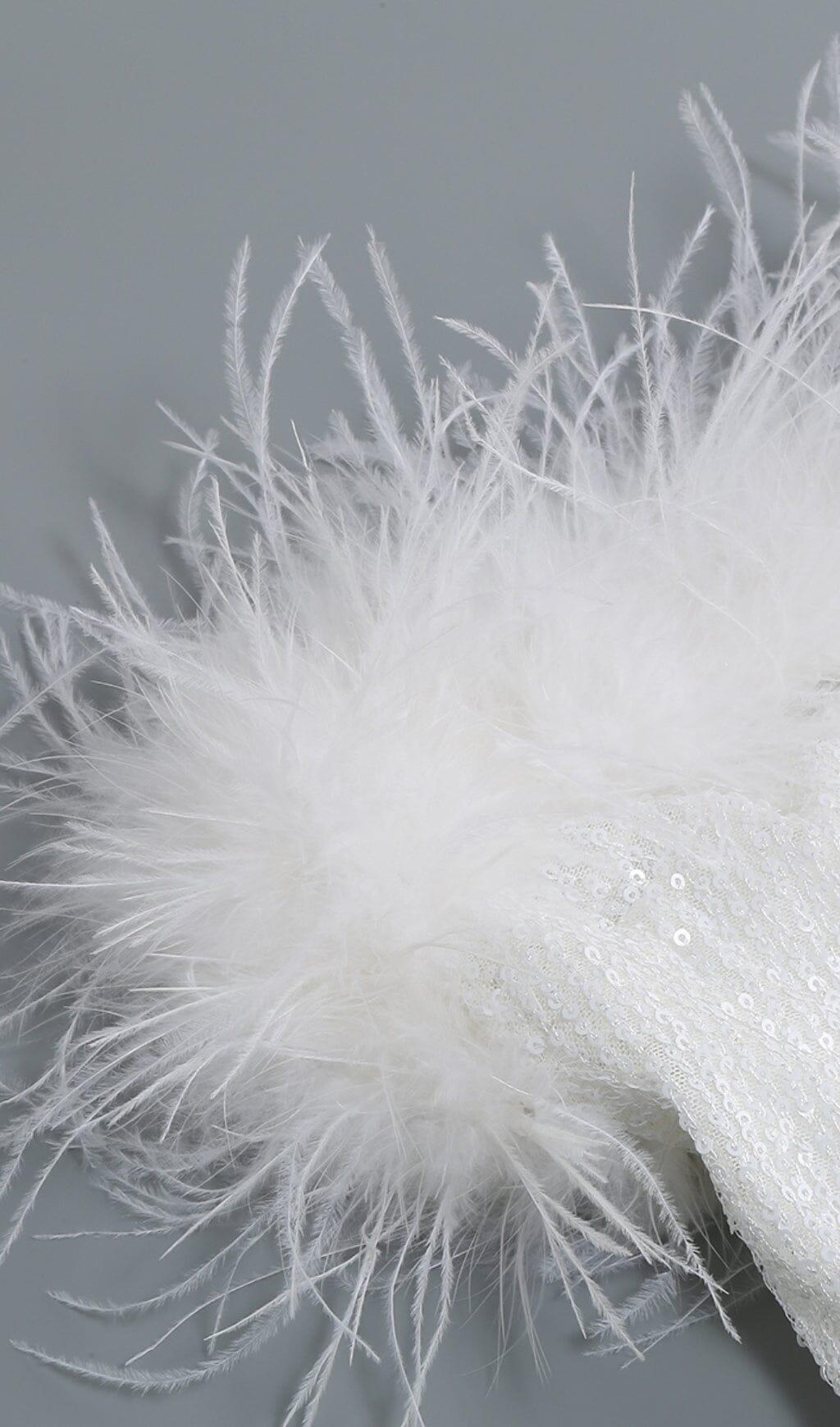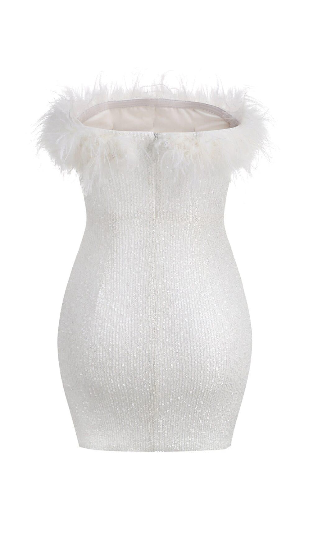 SEQUIN FEATHER STRAPLESS MINI DRESS IN WHITE