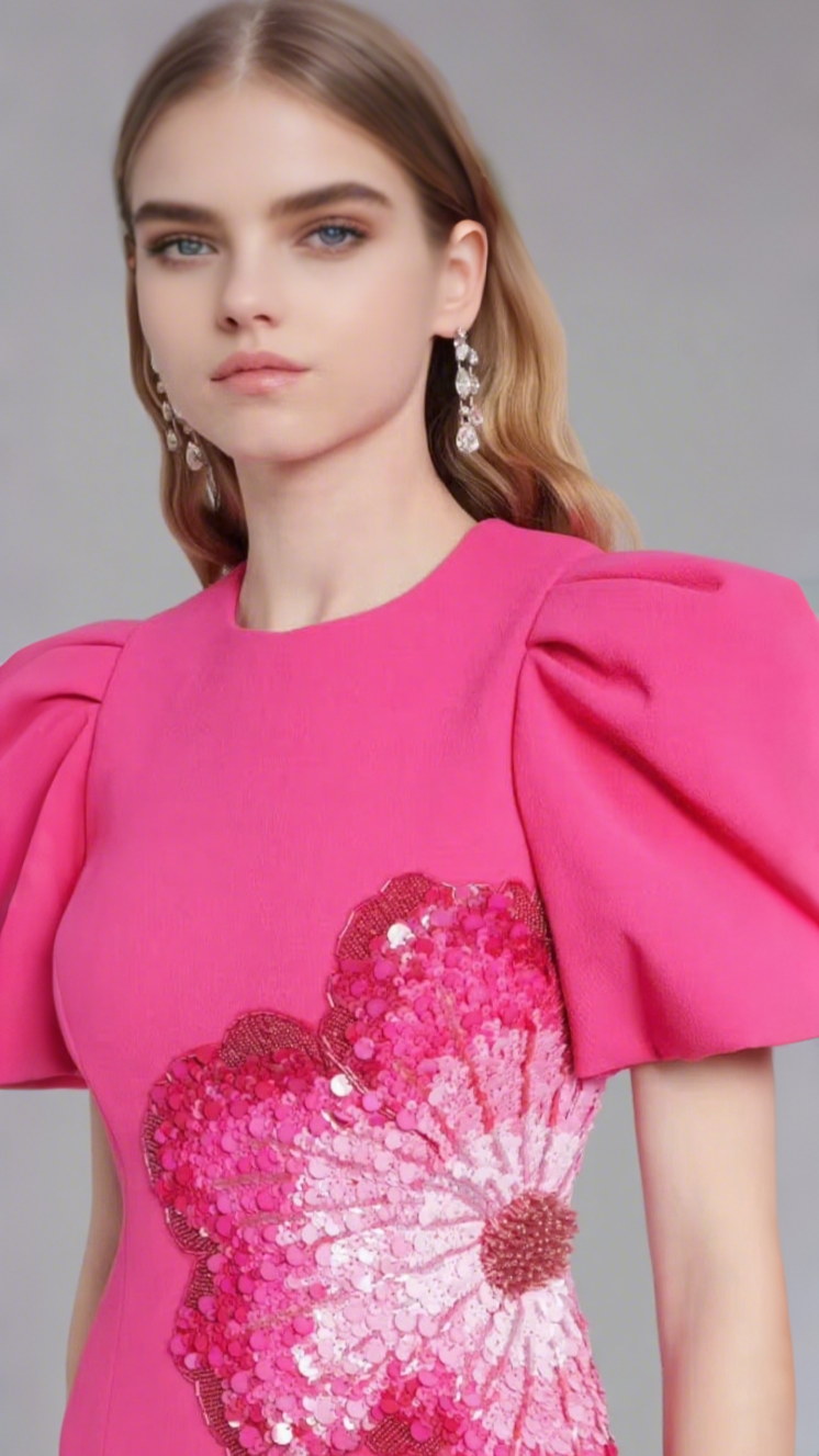 This pink midi dress features elegant puff sleeves and is adorned with delicate sequin flower embellishments, creating a refined, eye-catching look. Its flattering silhouette balances volume on the sleeves with a midi length, offering a sophisticated option for formal or special occasions. Crafted to combine subtle sparkle with a classic design, this dress delivers both style and comfort.