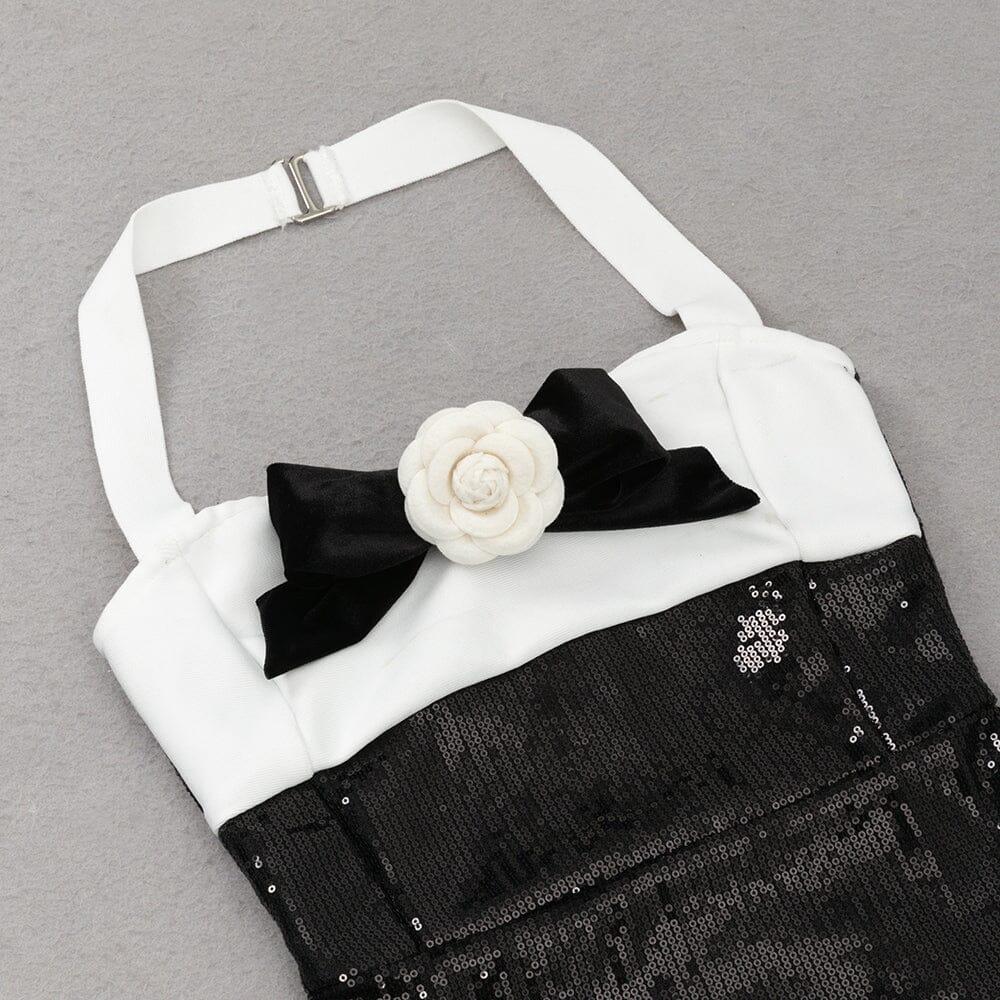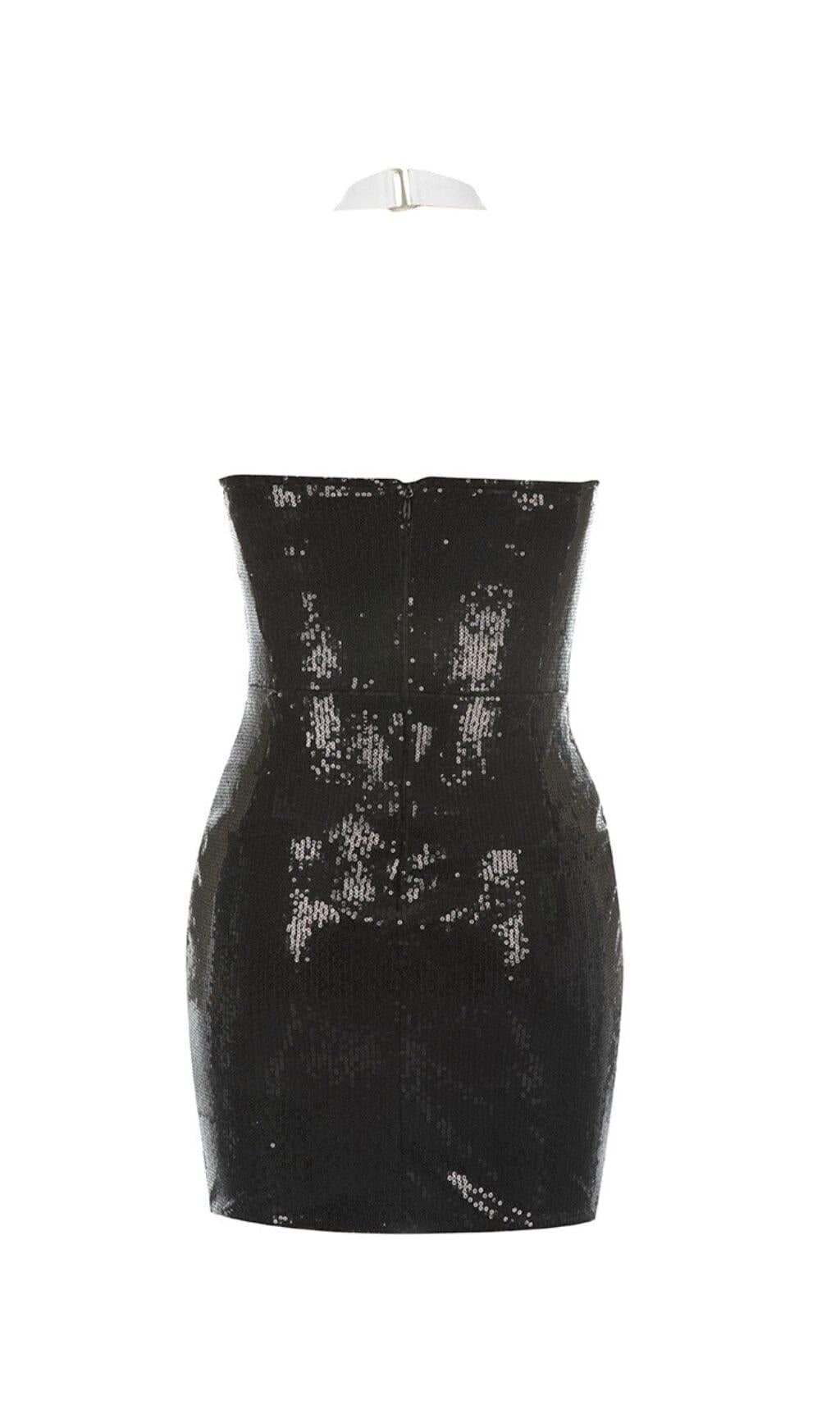 SEQUIN HALTER FLOWER MINI DRESS IN BLACK