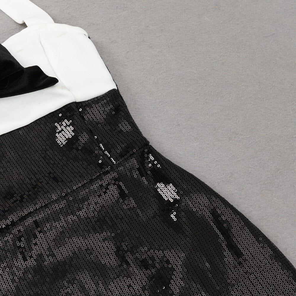 • Black sequins arranged in a floral pattern on the bodice, adding glamour and sparkle.