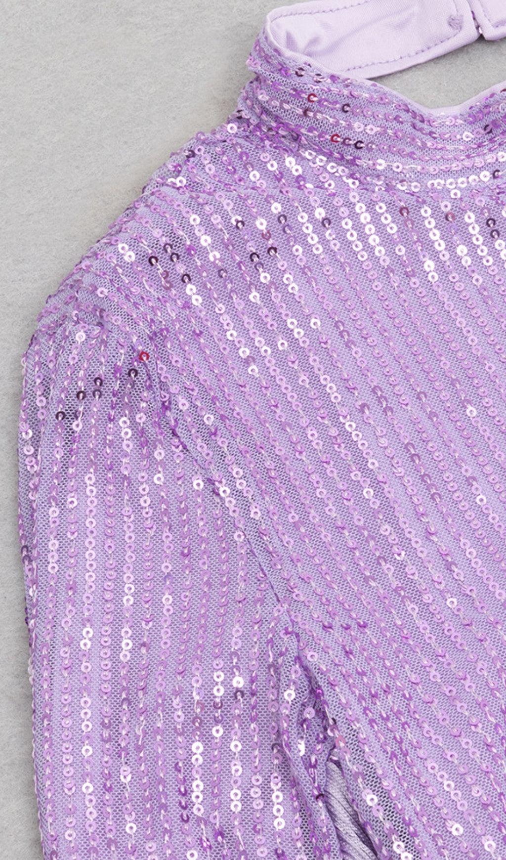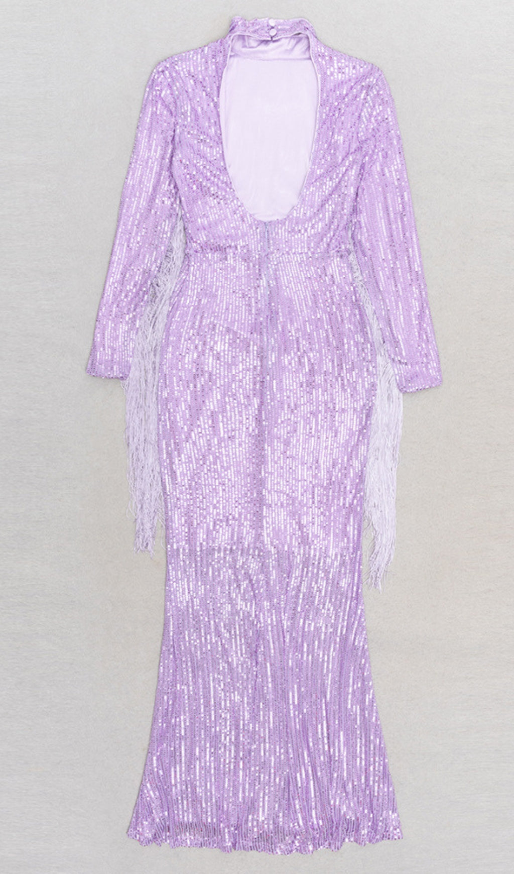 This dress features a lilac hue, all - over sequins, high neckline, and fringe sleeves. The form - fitting maxi silhouette is glamorous. Ideal for ��holiday break dress to impress�� gatherings, as ��hoco dress inspo�� for homecoming, or a ��celebrity event dress to impress�� occasion. Its sparkling, standout style lets you ��dress to impress�� with confidence, perfect for formal events, galas, or special outings to shine.