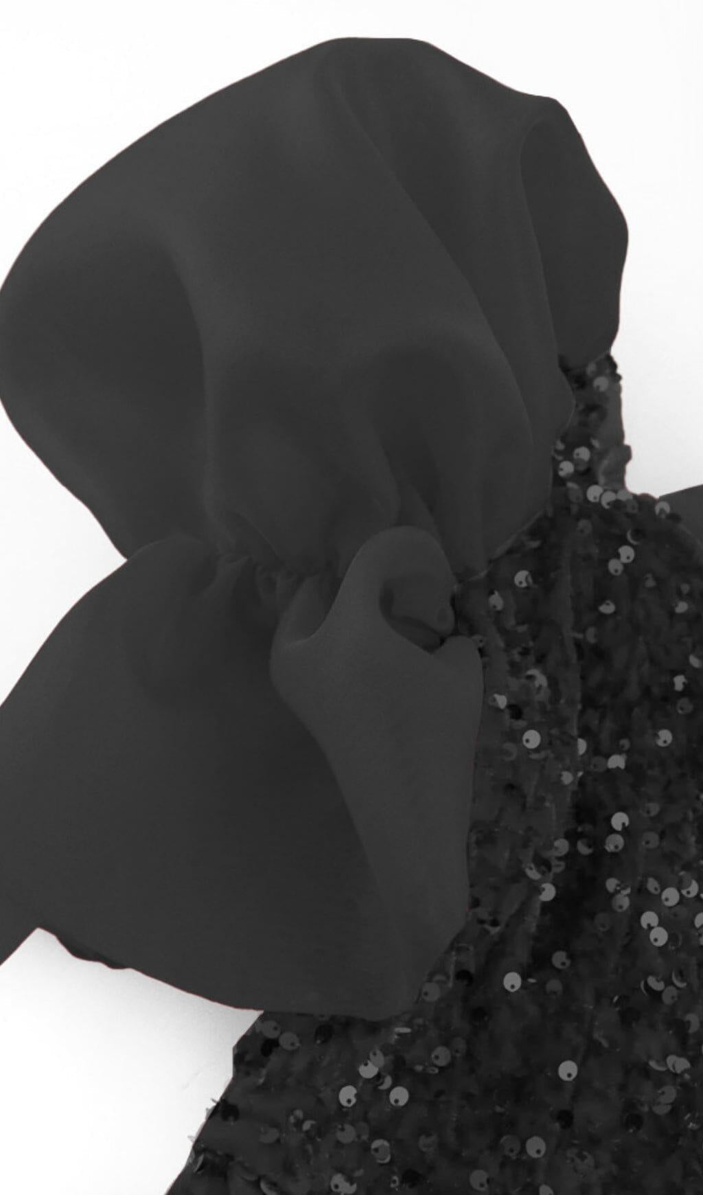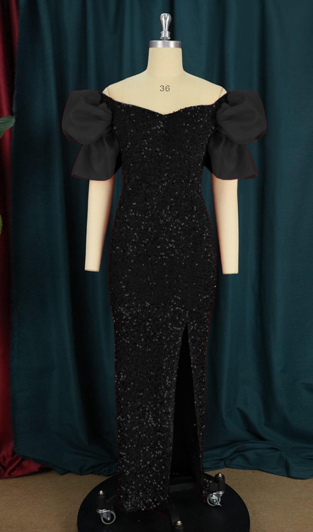SEQUIN PUFF SLEEVE ONE NECK WAIST MAXI DRESS IN BLACK