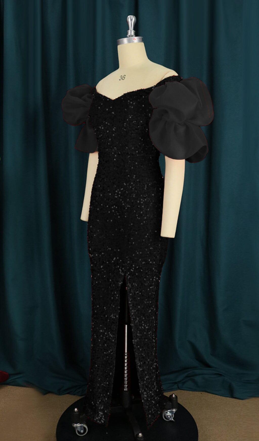 Introducing the Sequin Puff Sleeve One Neck Waist Maxi Dress in Black