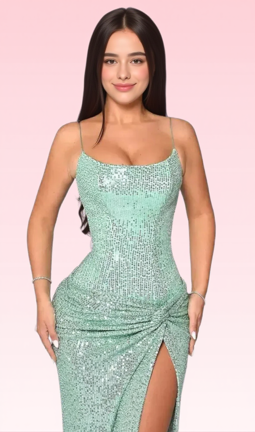 Expertly designed for a flawless fit, our sequin ruched high slit maxi dress in green exudes elegance and sophistication. The figure-hugging silhouette is accentuated by the ruched detailing, while the high slit adds a touch of allure. Perfect for special occasions or a night out, this dress is sure to make a statement.