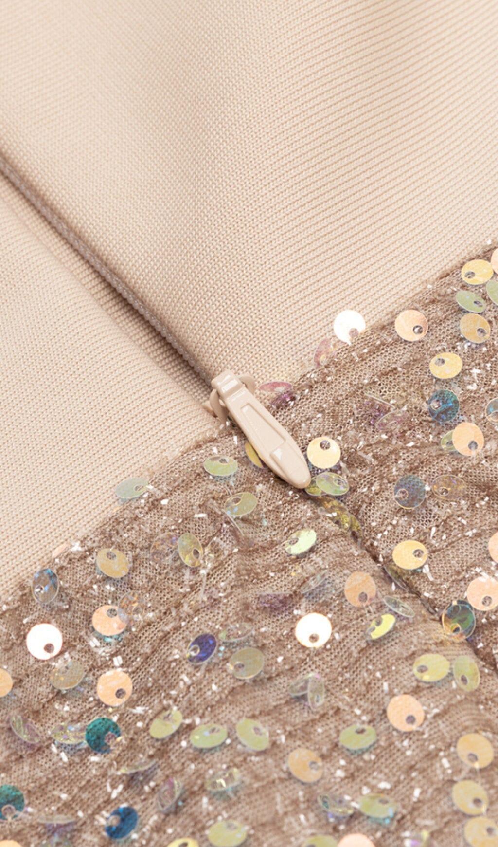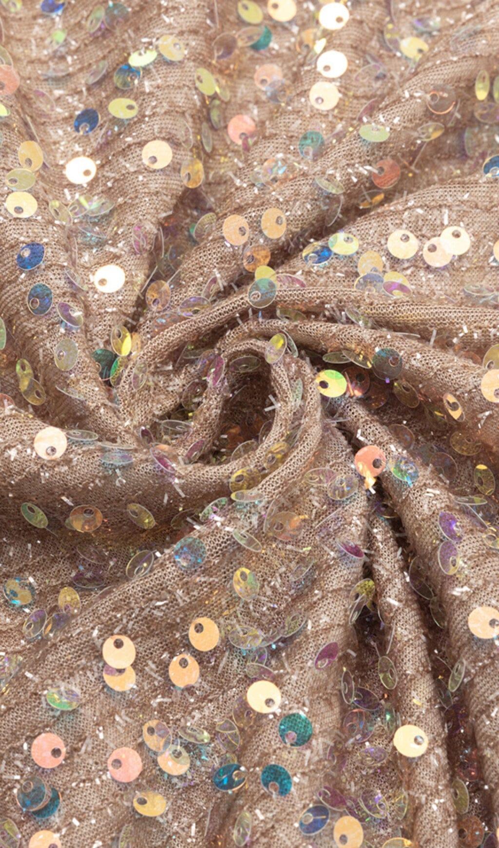 SEQUIN RUCHED SLIT MIDI DRESS IN GOLD