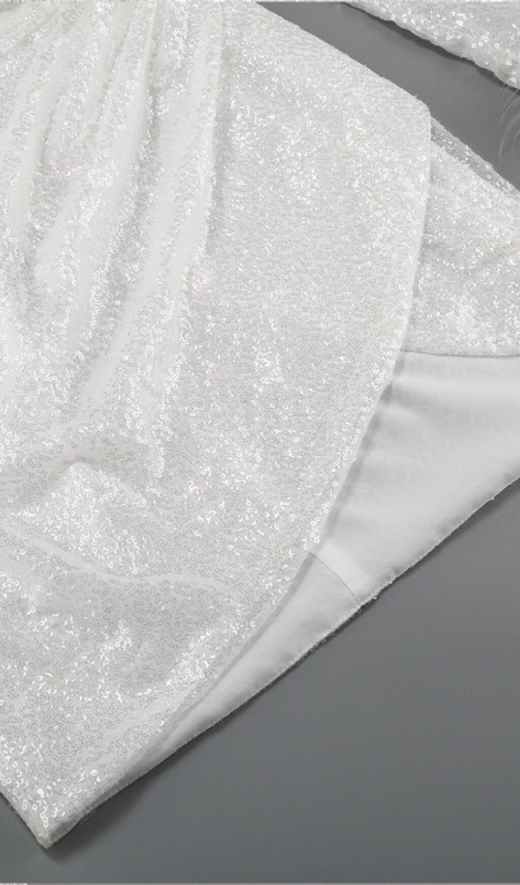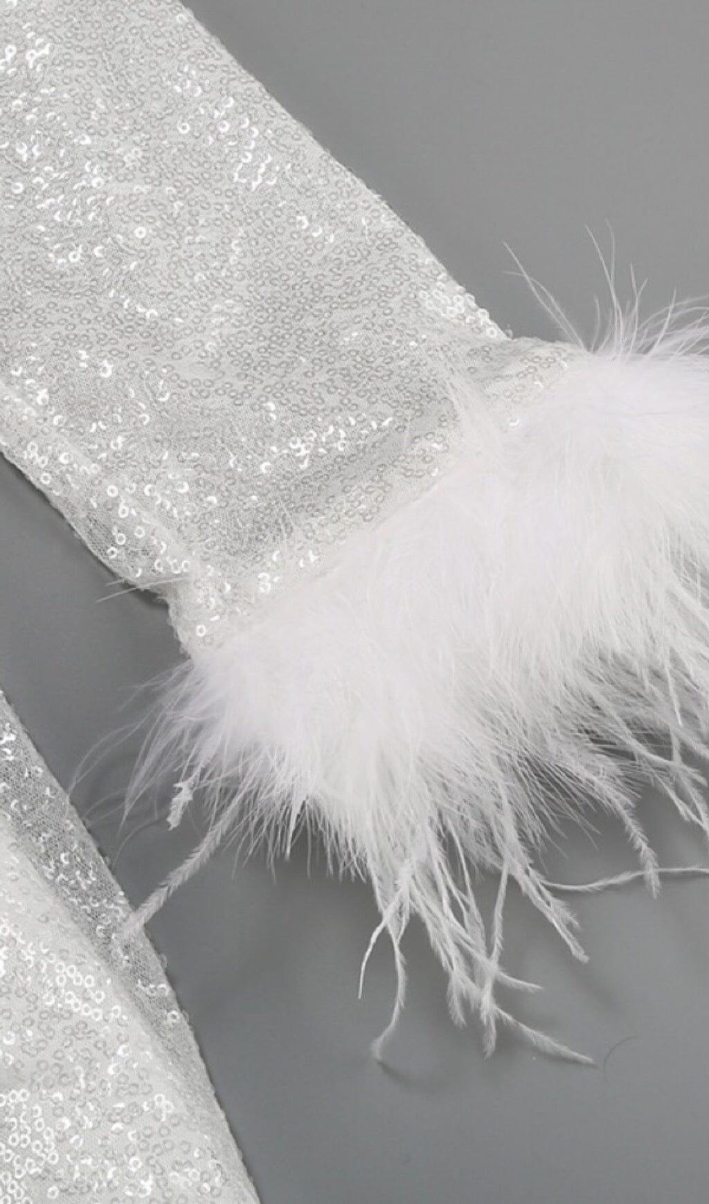 SEQUINED FEATHER MINI DRESS IN WHITE