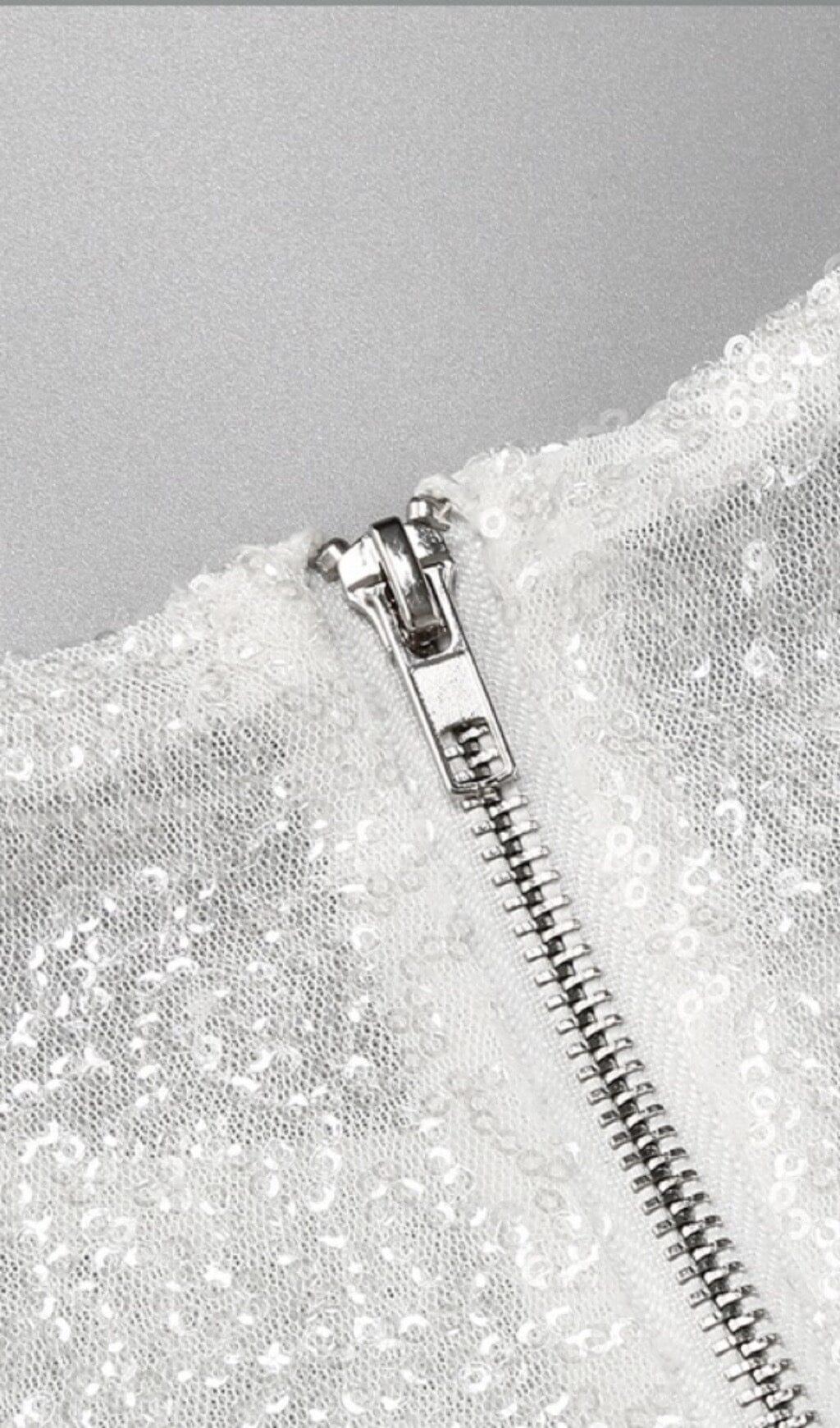 Get ready to turn heads at your next party with our stunning Sequined Feather Mini Dress in White. This dress combines glamorous sequin fabric, feather sleeve design, and shoulder pads to create a truly captivating look. The unique stacking method seamlessly integrates these elements, resulting in a dress that exudes style and sophistication.