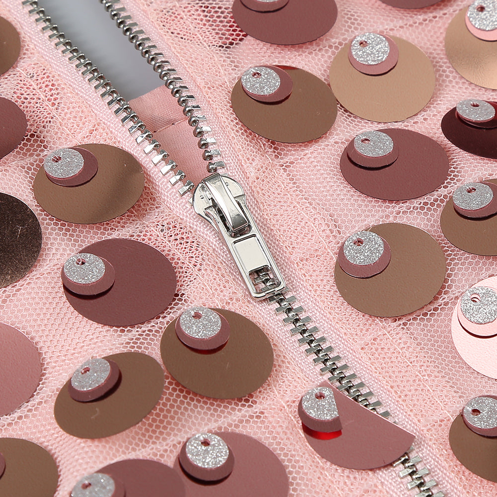 • Allover sequin embellishments with feather trim