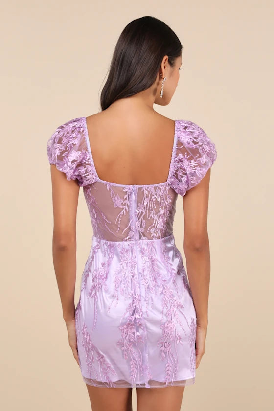 Seriously Cute Lavender Embroidered Mesh Puff Sleeve Mini Dress