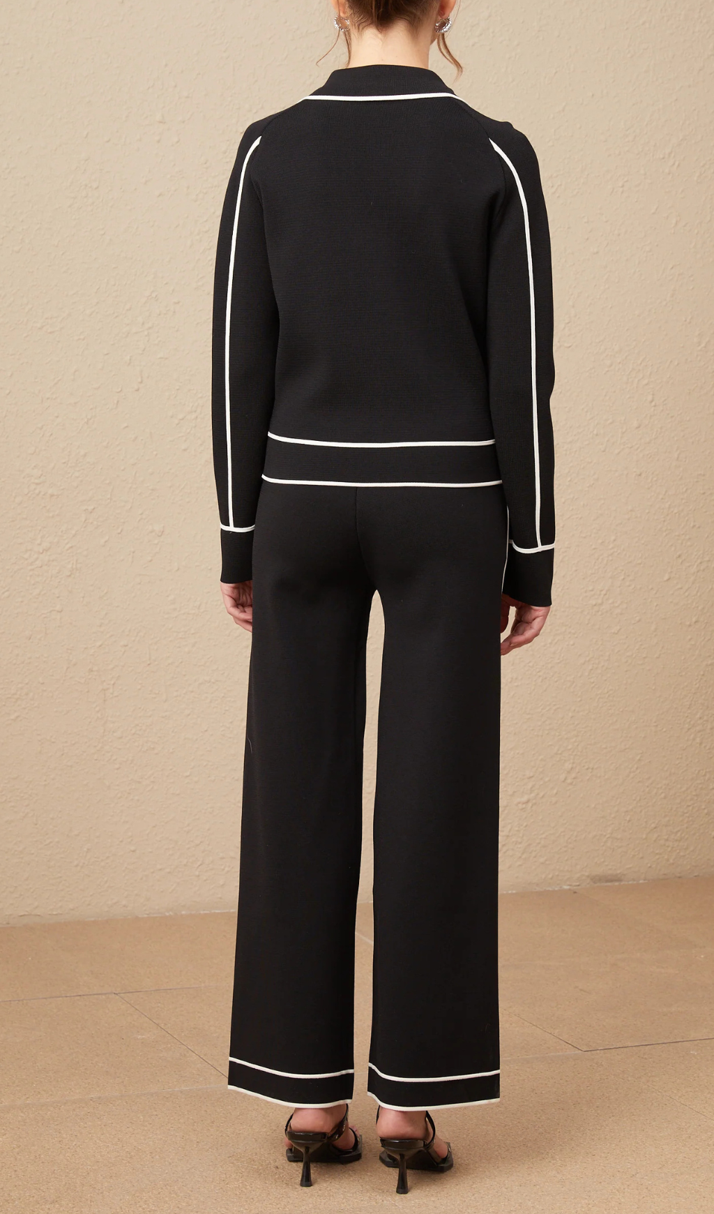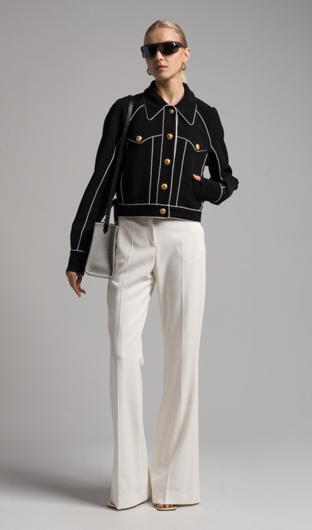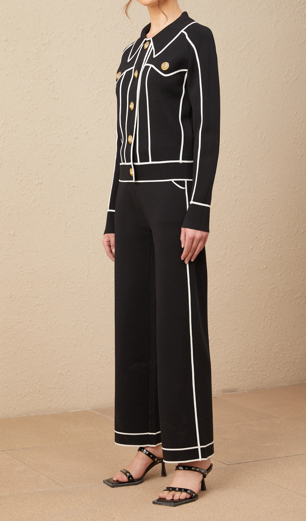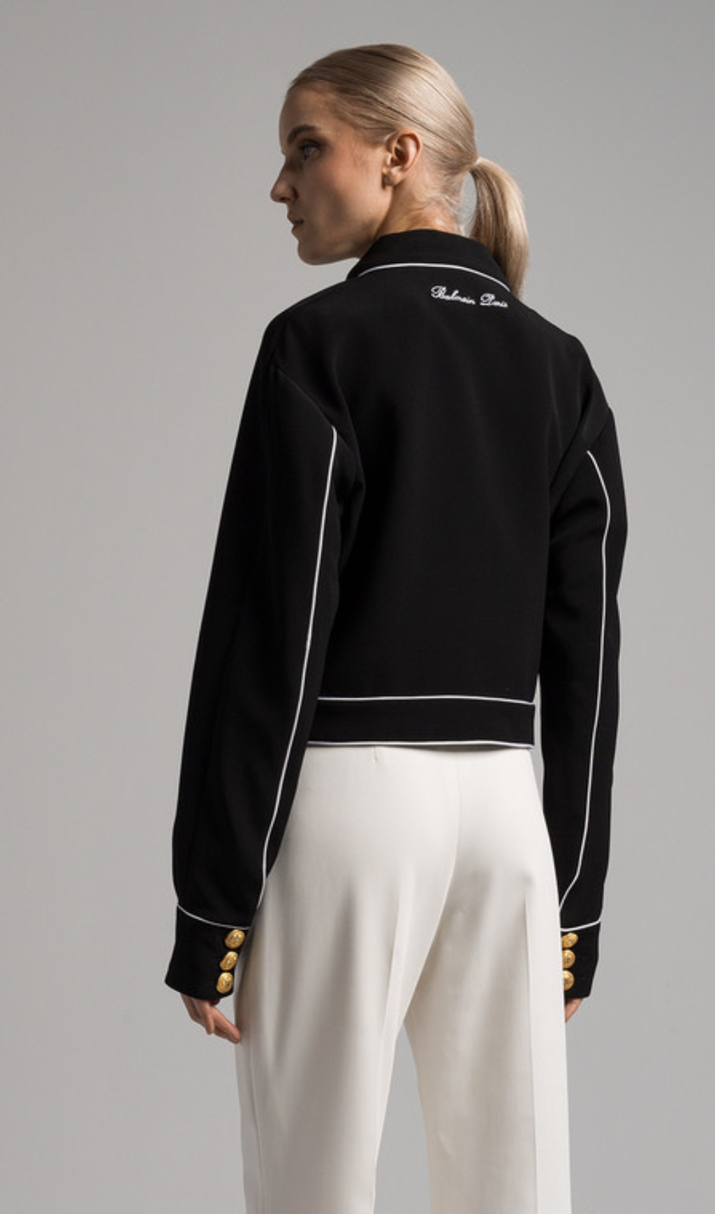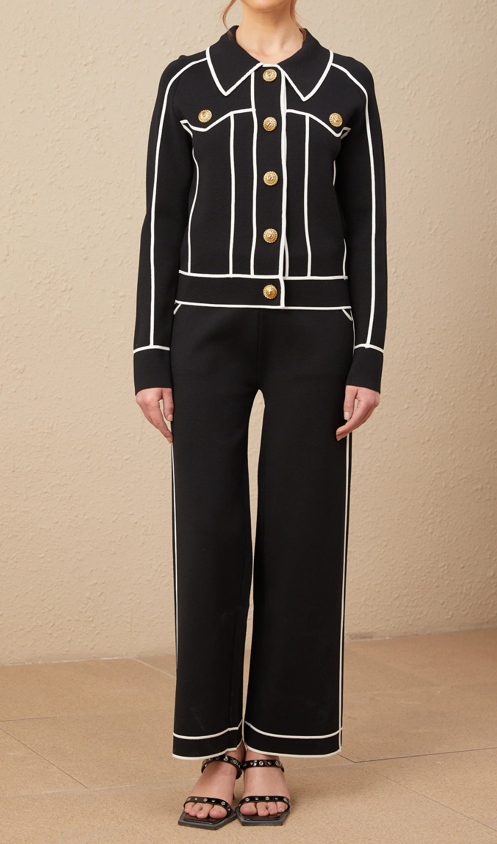 seven-button black piped-trim jacket