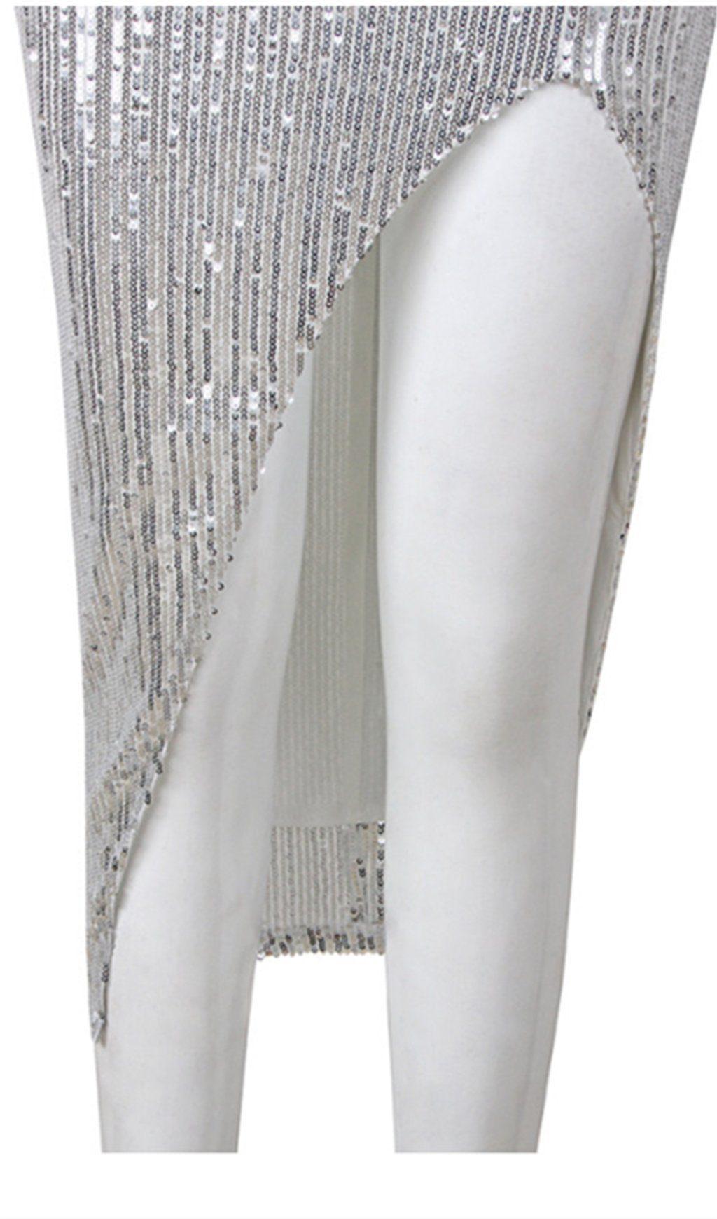 This Silver Slit Cocktail Dress is the epitome of elegance and style. Designed with attention to detail and made from high-quality sequin fabric, this dress is perfect for any special occasion. Whether you're attending a cocktail party, a wedding, or a formal event, this dress will make you stand out from the crowd.