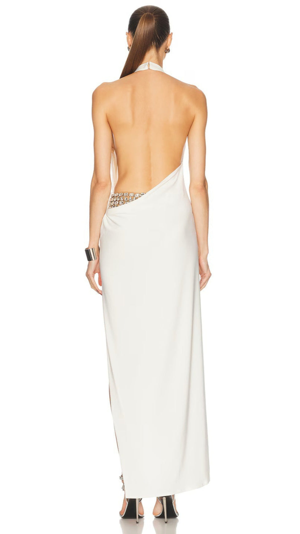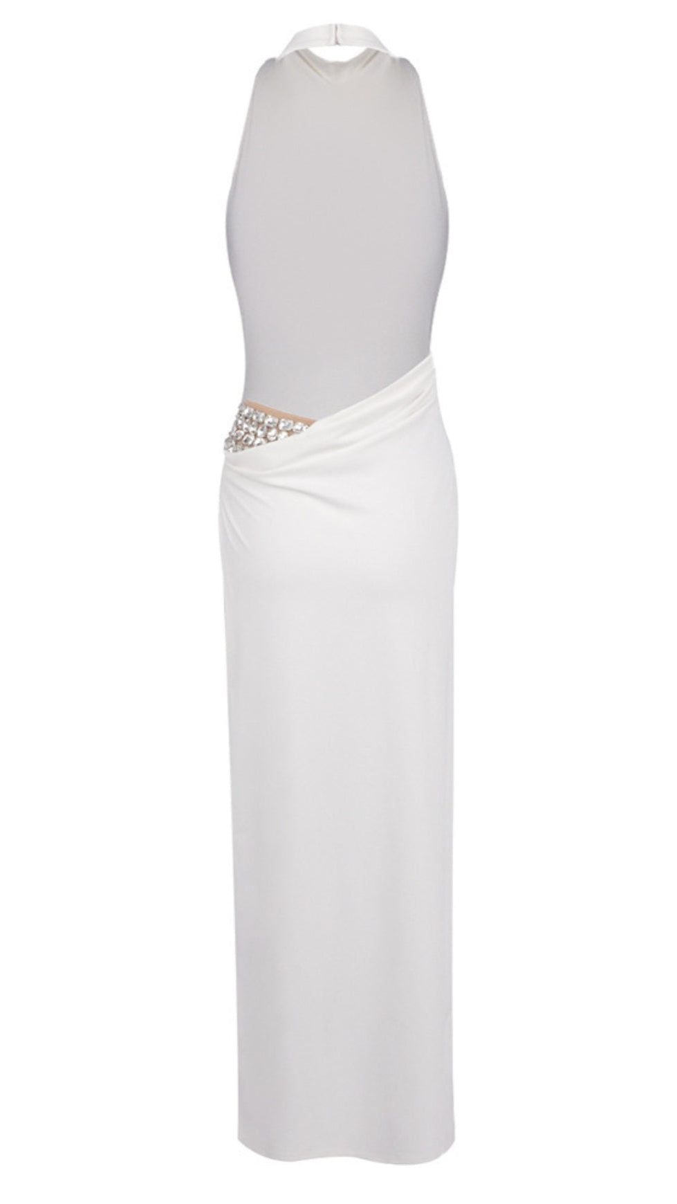 SEXY WHITE SATIN HALTER MAXI DRESS WITH HIGH SLIT AND OPEN BACK