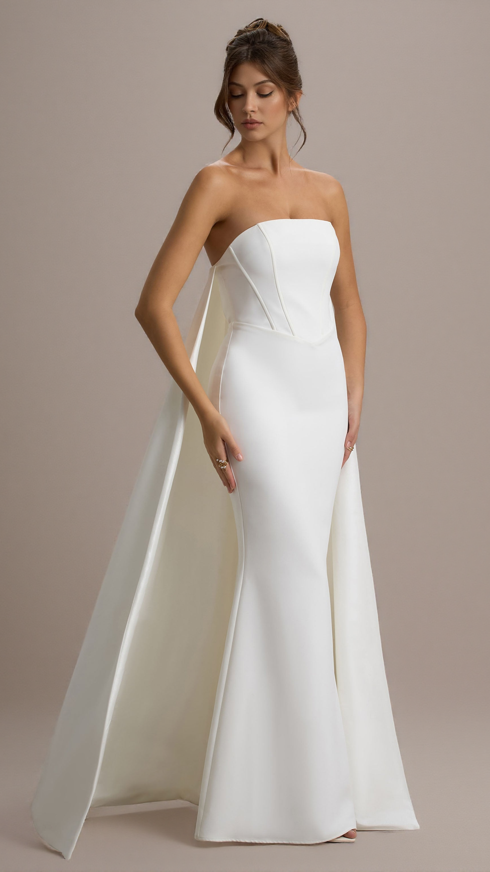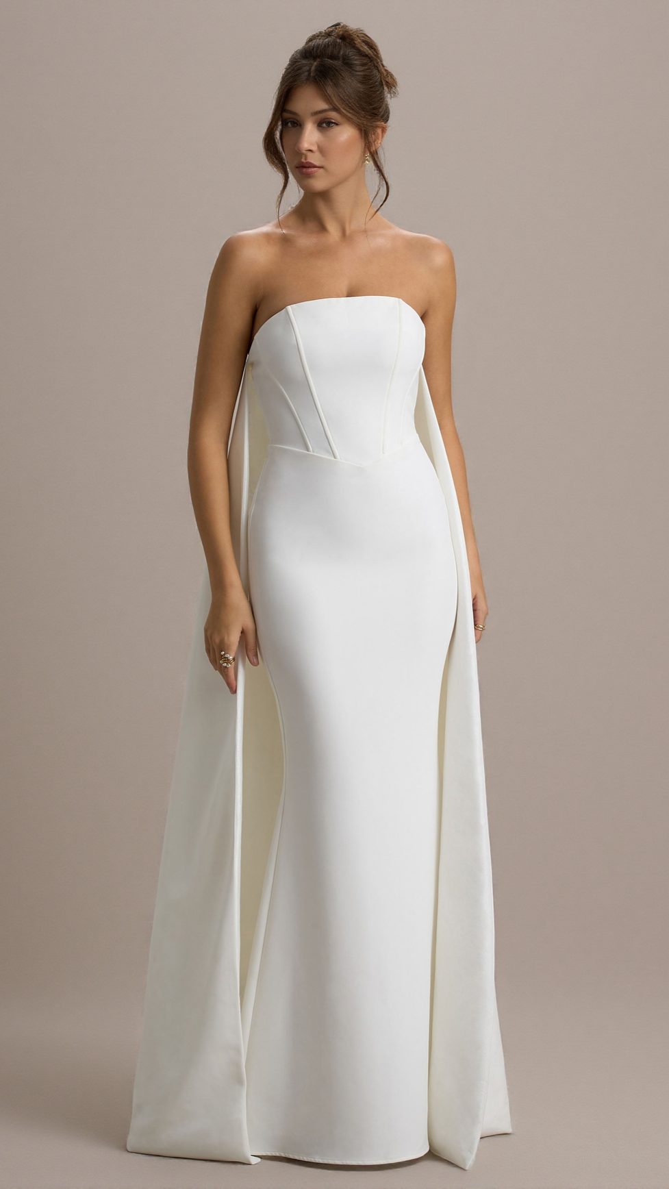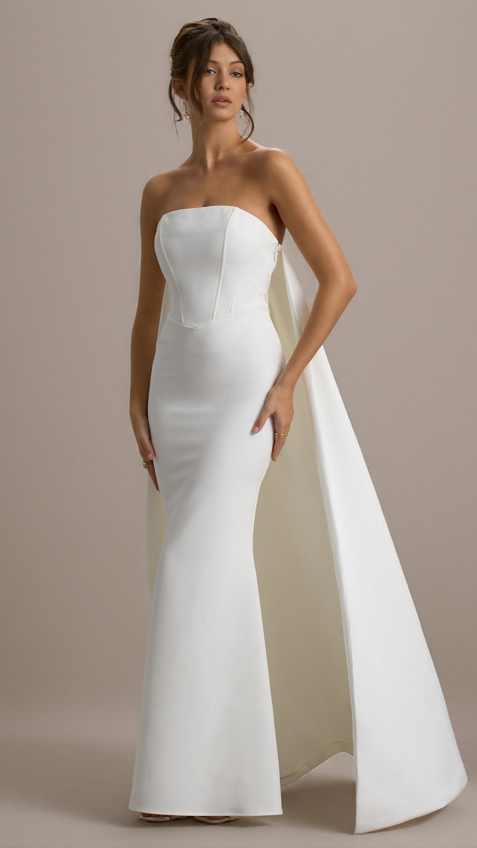 If you're looking for an entrance-making dress, She's Trouble is it. Exuding an ethereal glamour, this white maxi dress features a classic bandeau neckline and sculpting boned bodice. A key element of this captivating floor-sweeper is its eye-catching cape that flows freely behind you as you move.