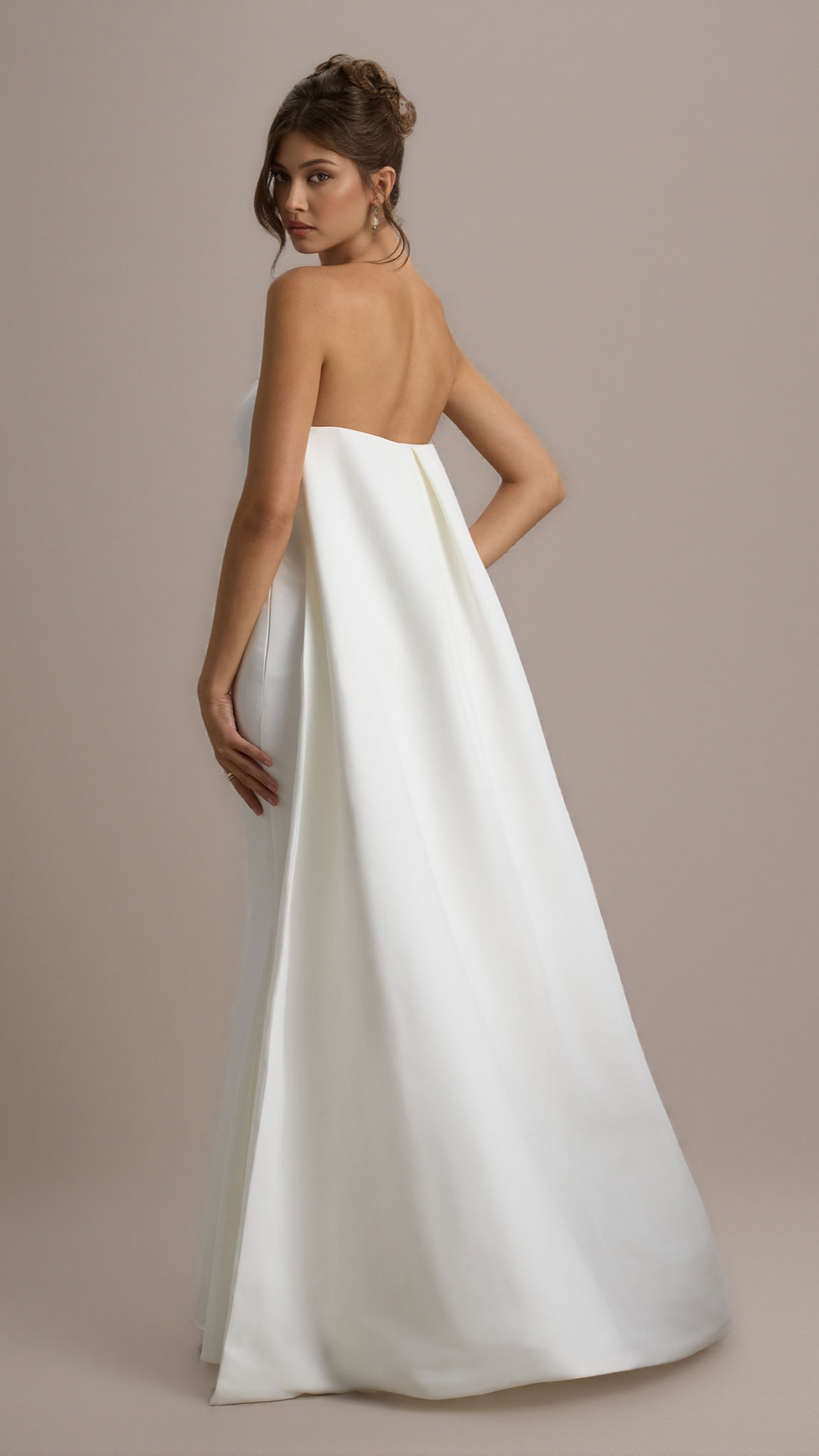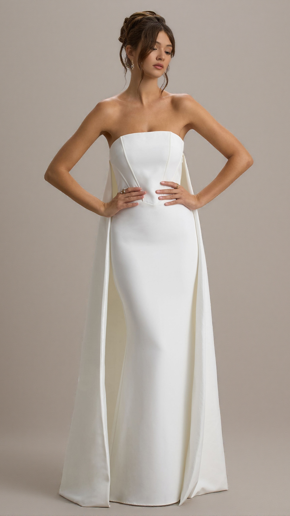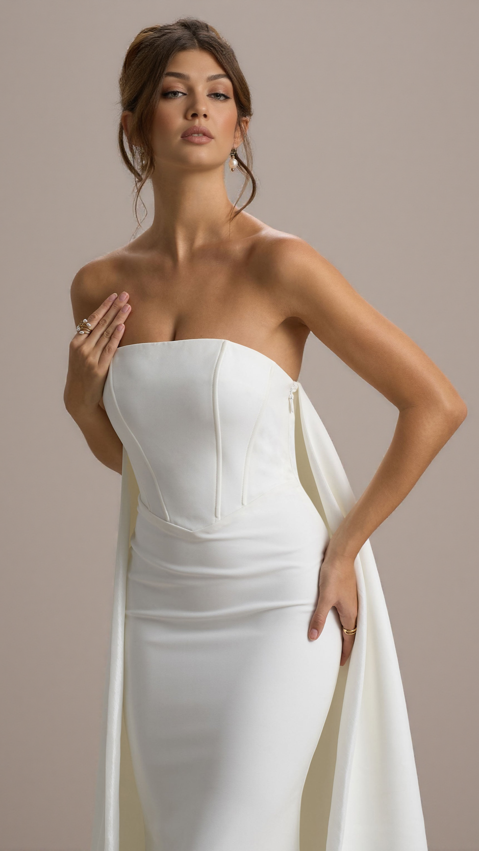 If you're looking for an entrance-making dress, She's Trouble is it. Exuding an ethereal glamour, this white maxi dress features a classic bandeau neckline and sculpting boned bodice. A key element of this captivating floor-sweeper is its eye-catching cape that flows freely behind you as you move.