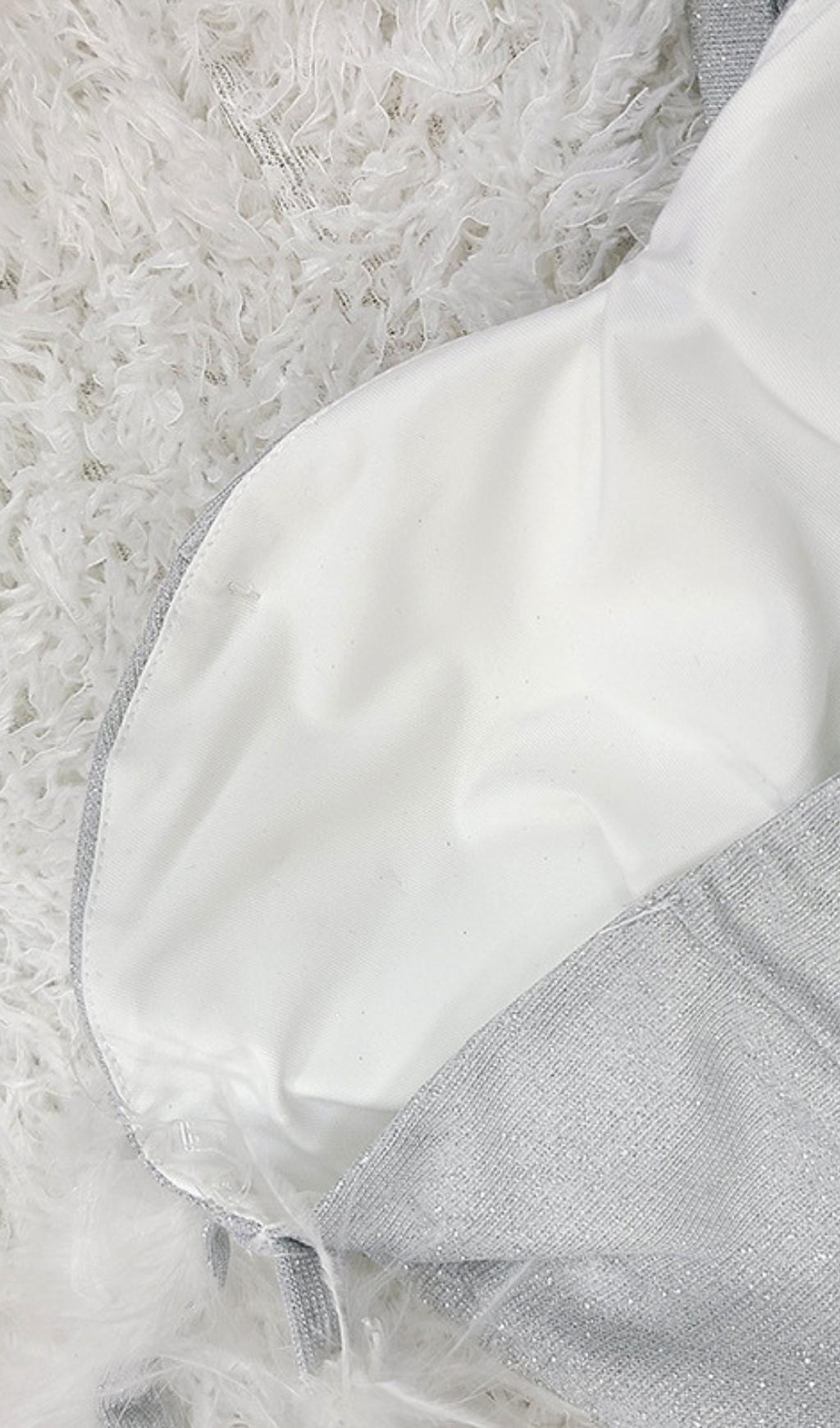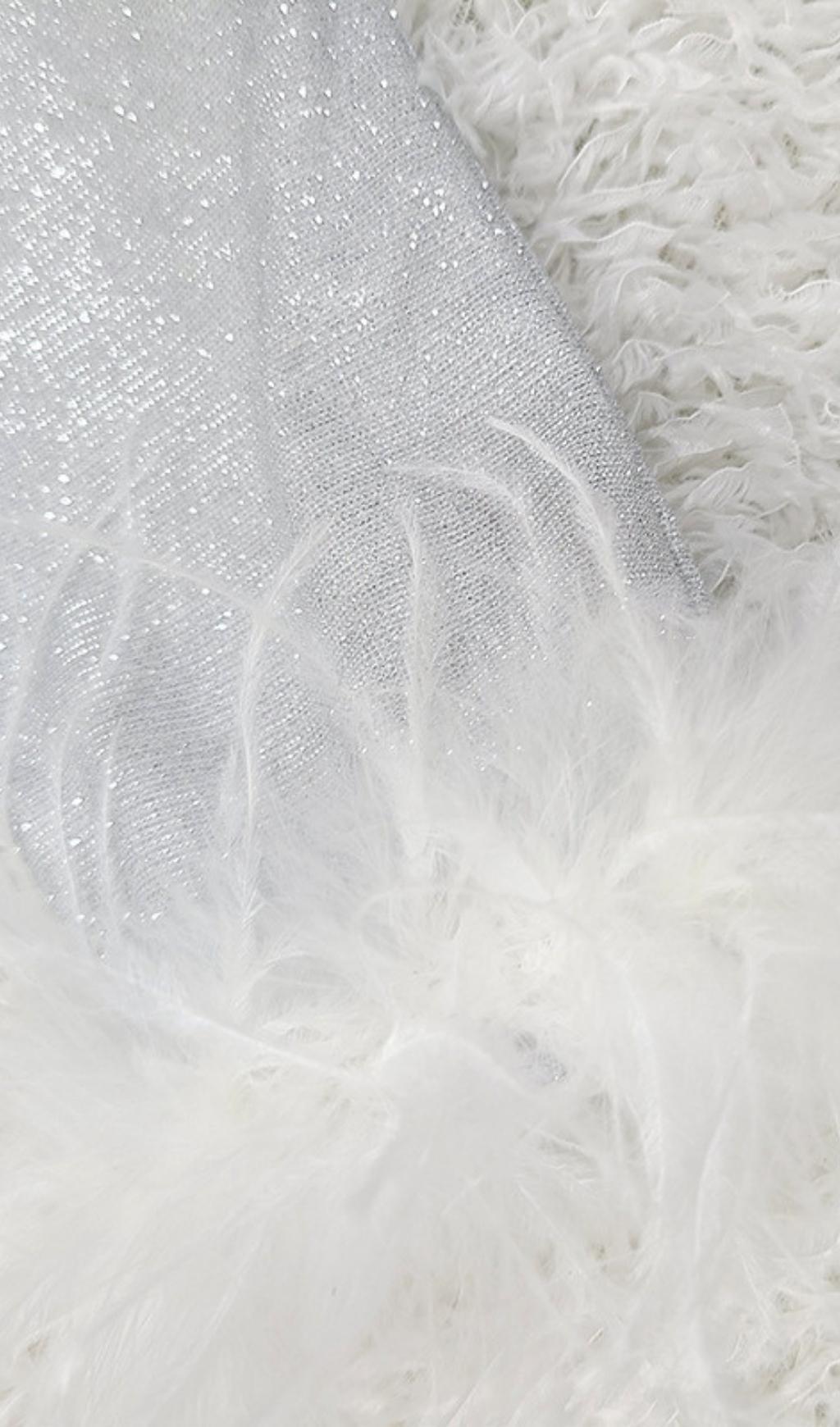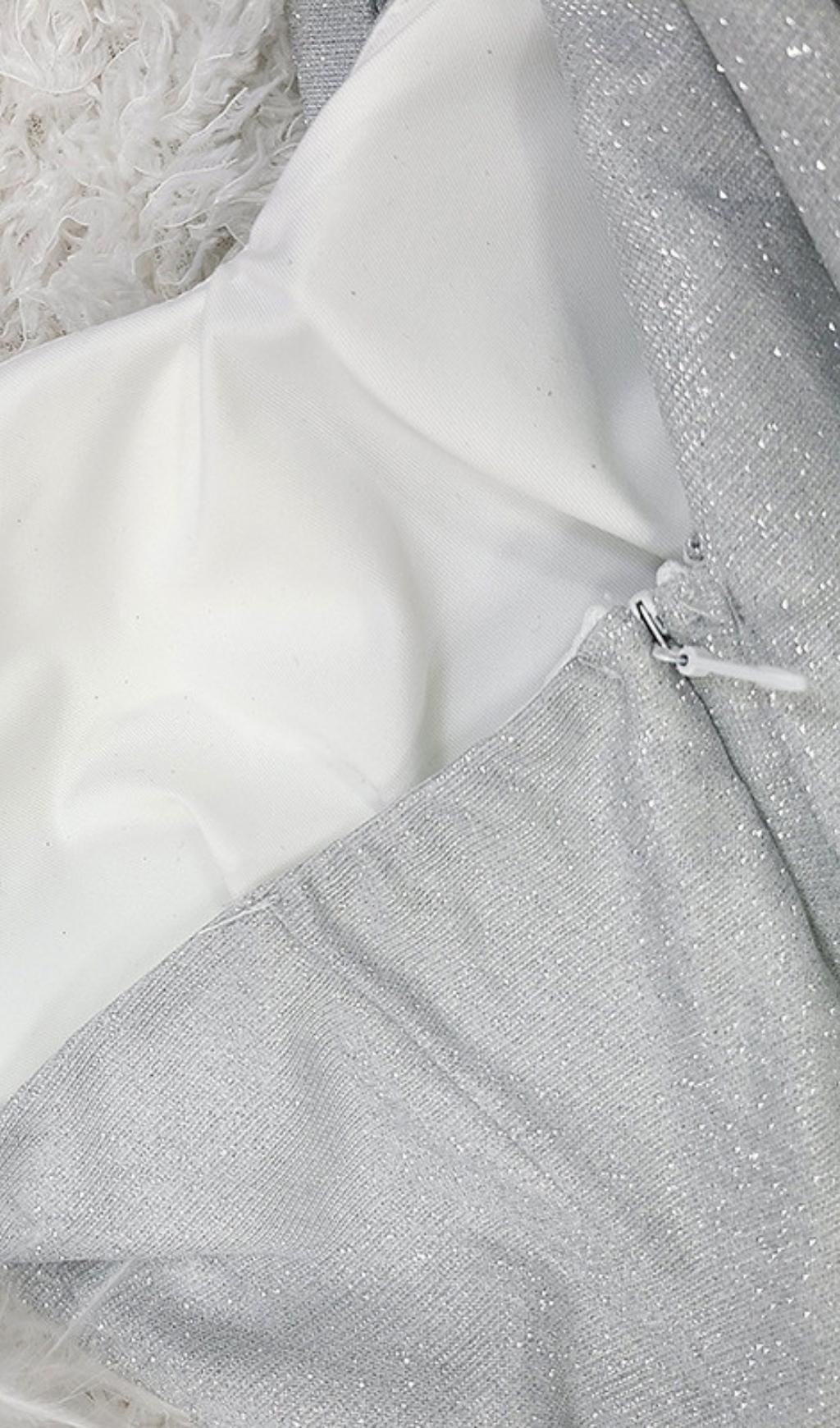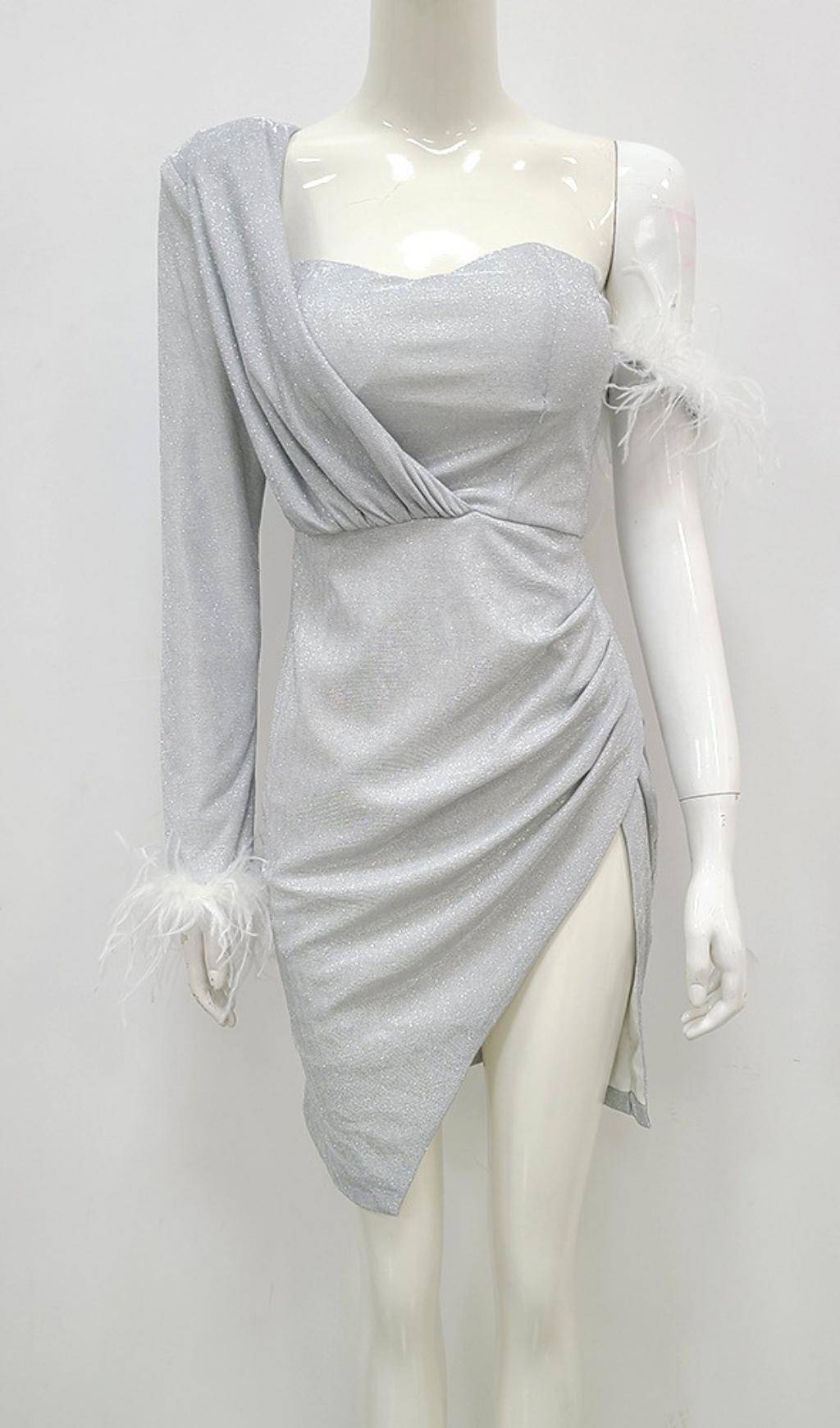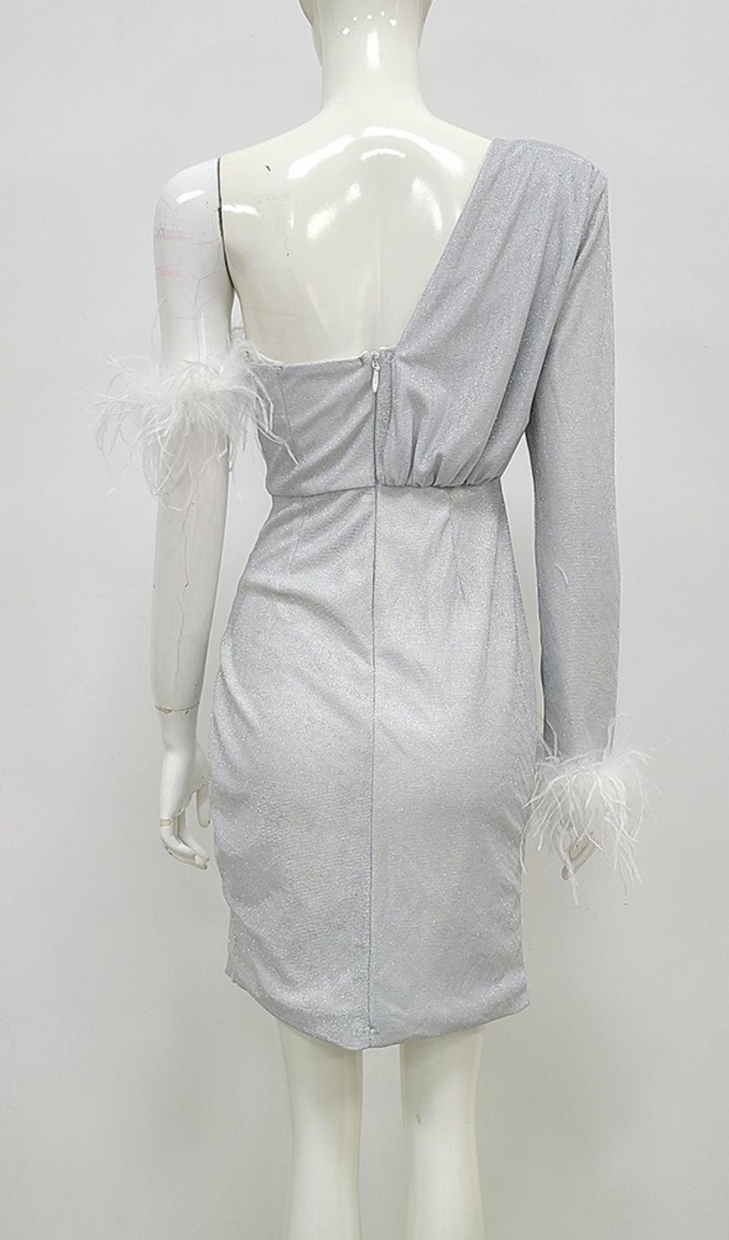 LONG SLEEVE SEQUIN FEATHER MINI DRESS IN SILVER