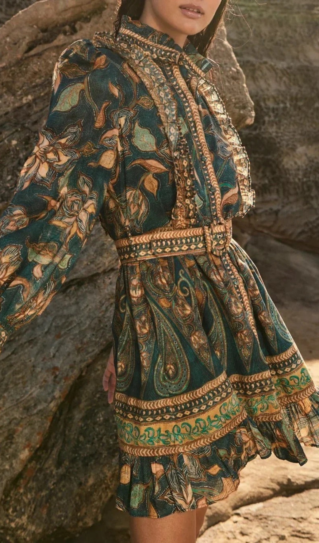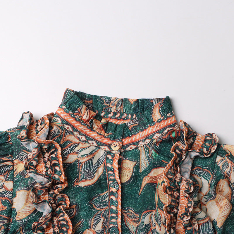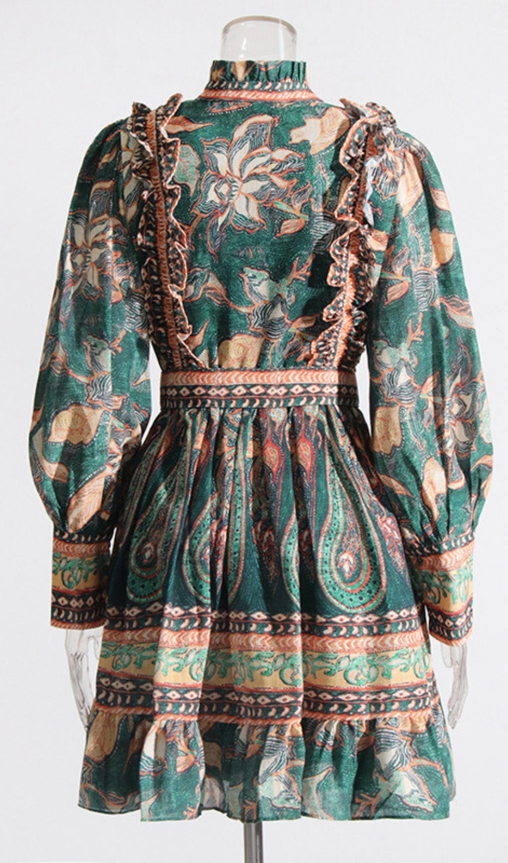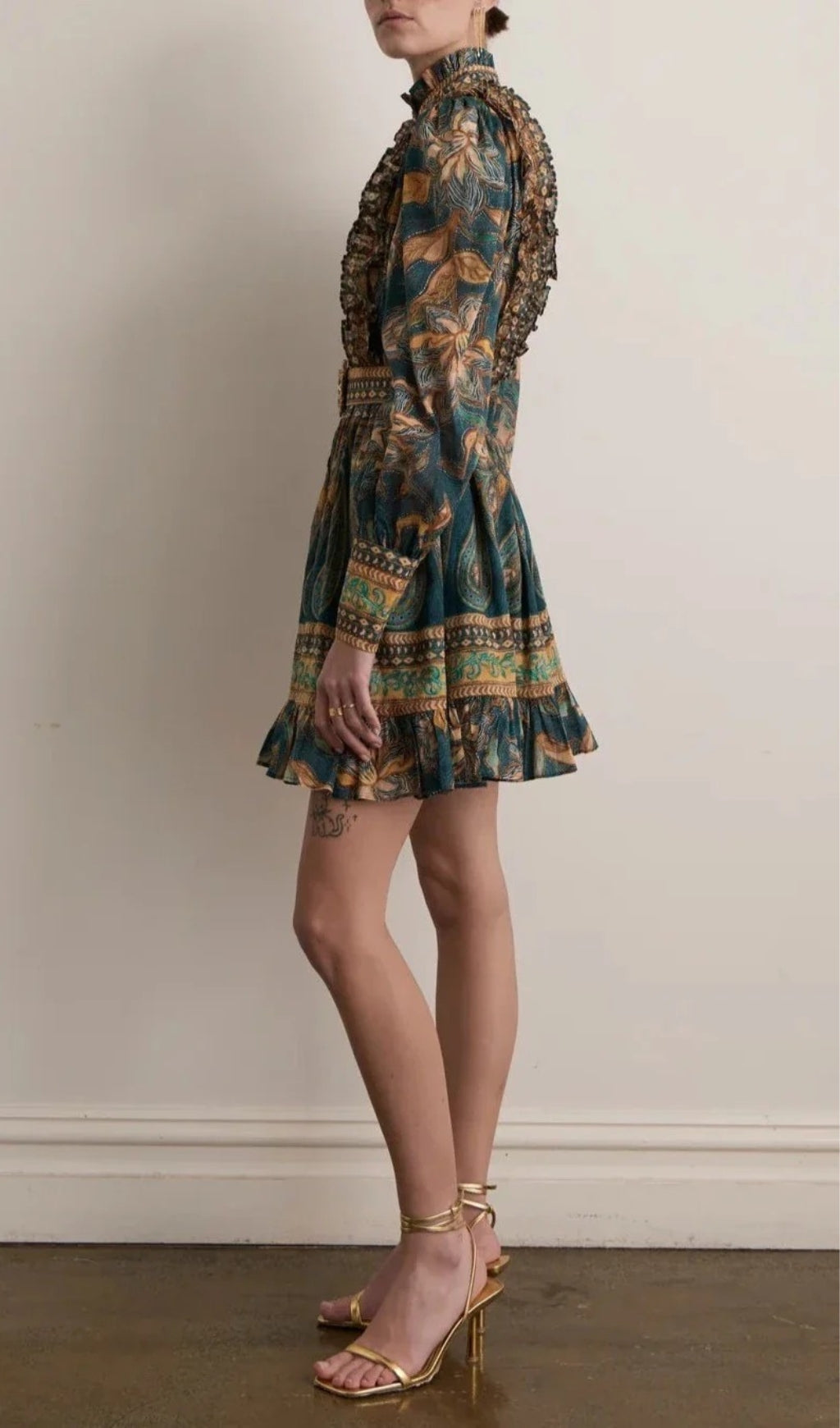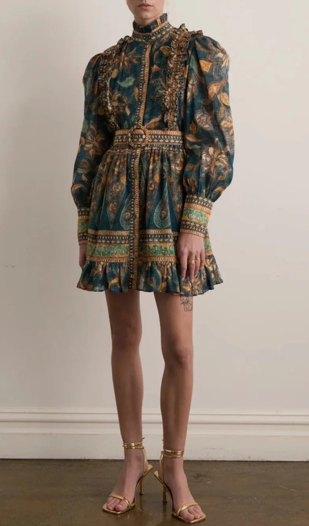 - High neckline with frill detail
