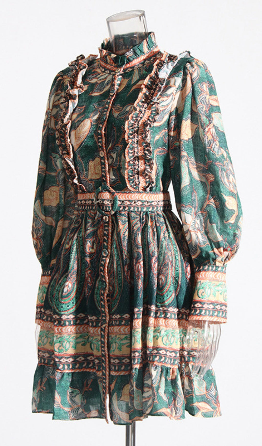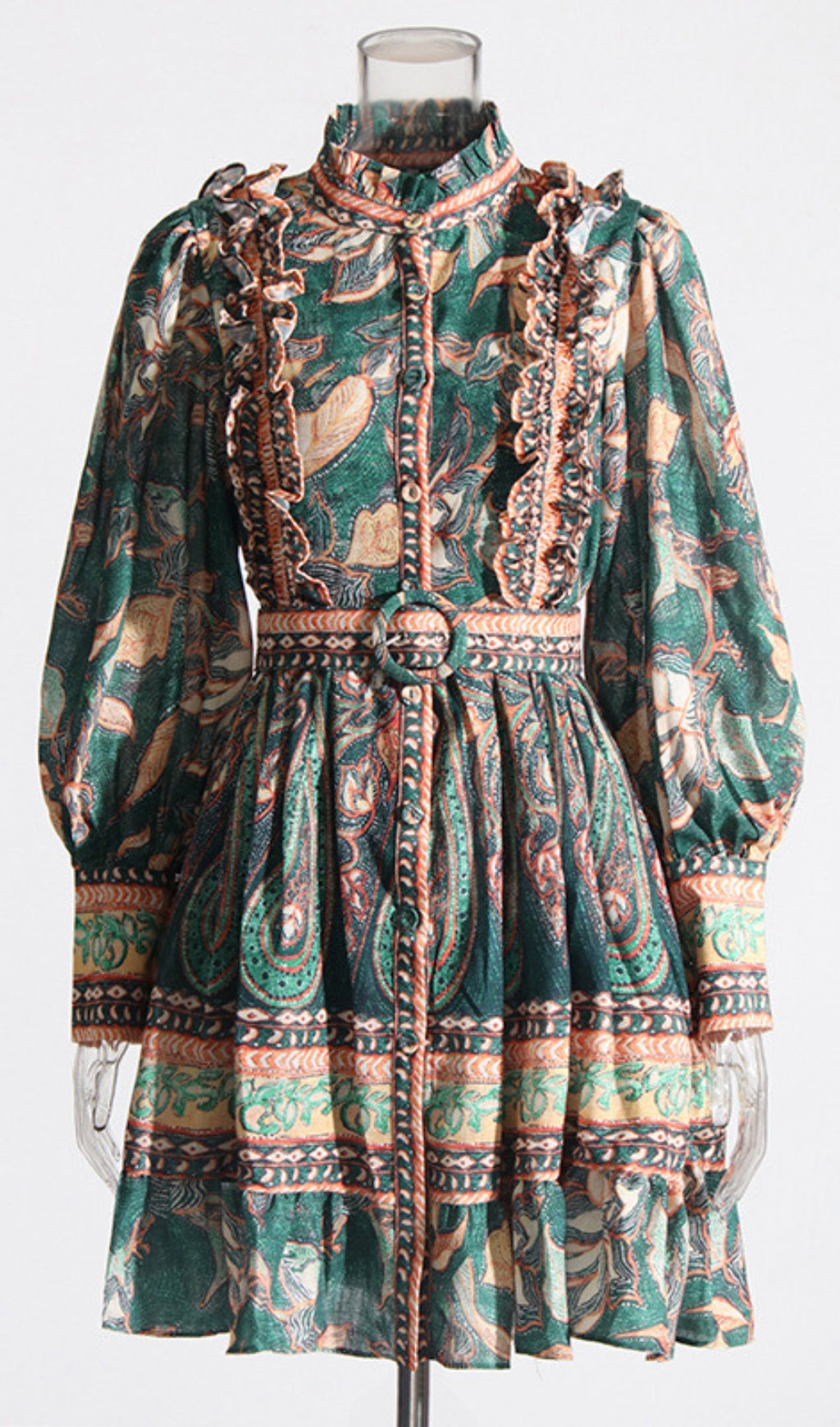 A light weight textured cotton dress featuring a high frill neckline, self covered buttons, with frill detail on bodice and a self covered waist belt with circle buckle. Beautiful puff sleeves with large cuff and frilled skirt.