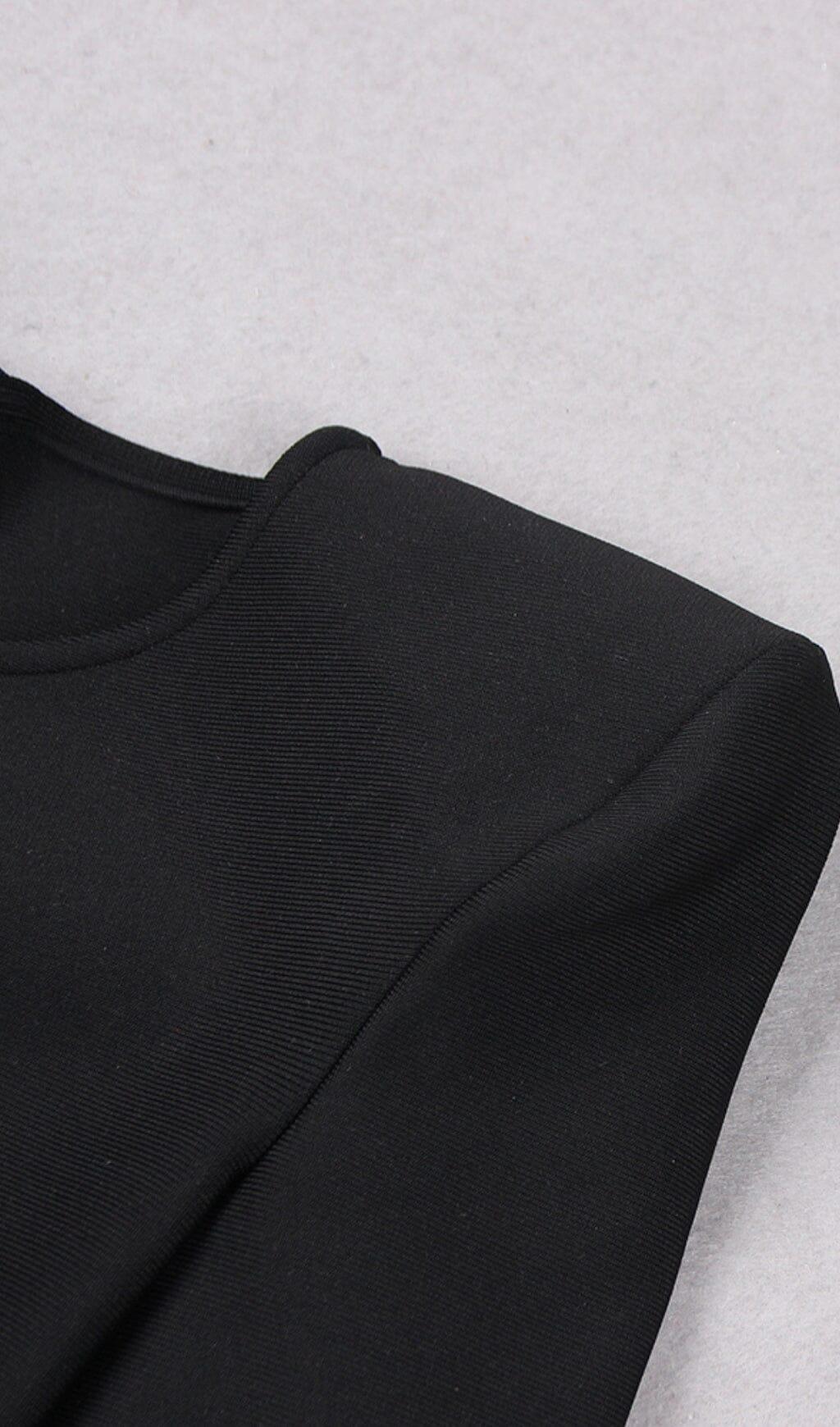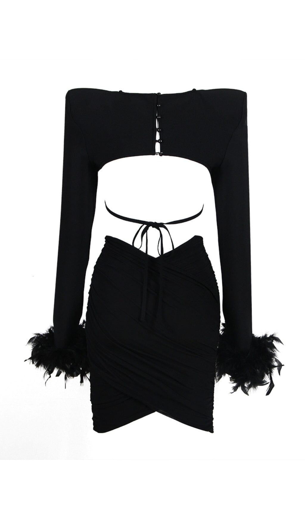 SHOULEDR PAD WAIST BARING FEATHER BLOUSE PLEATED DRESS IN BLACK