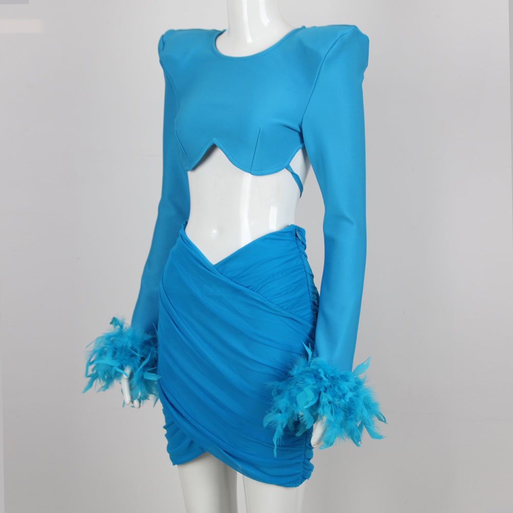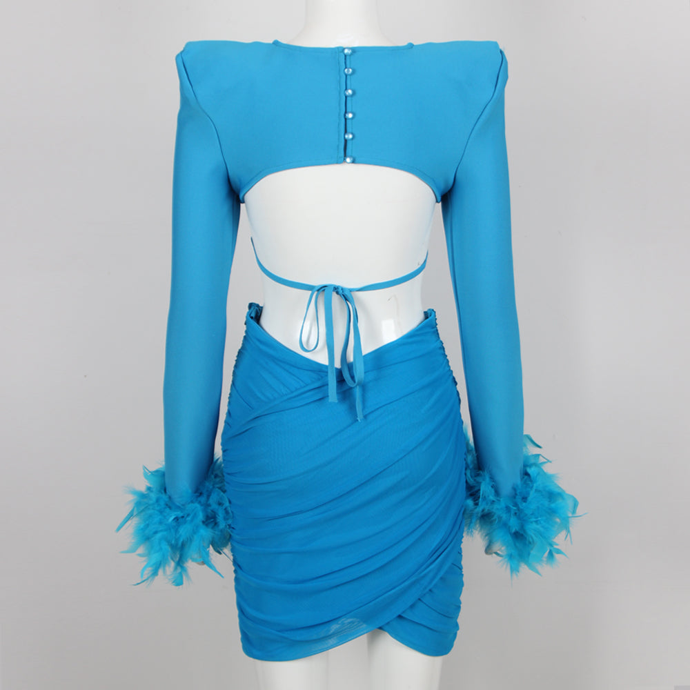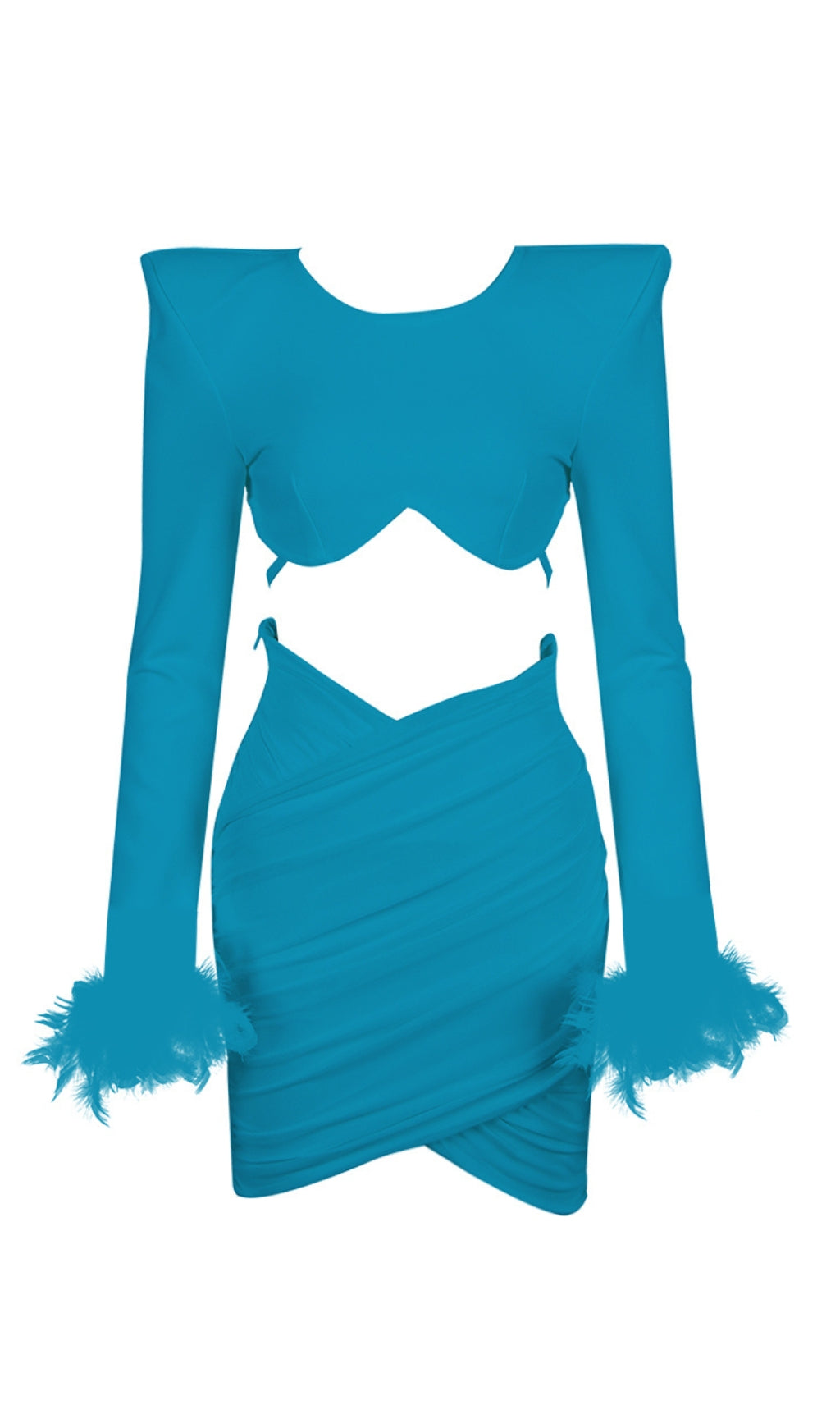 ADIVA BLUE FEATHER BLOUSE PLEATED DRESS