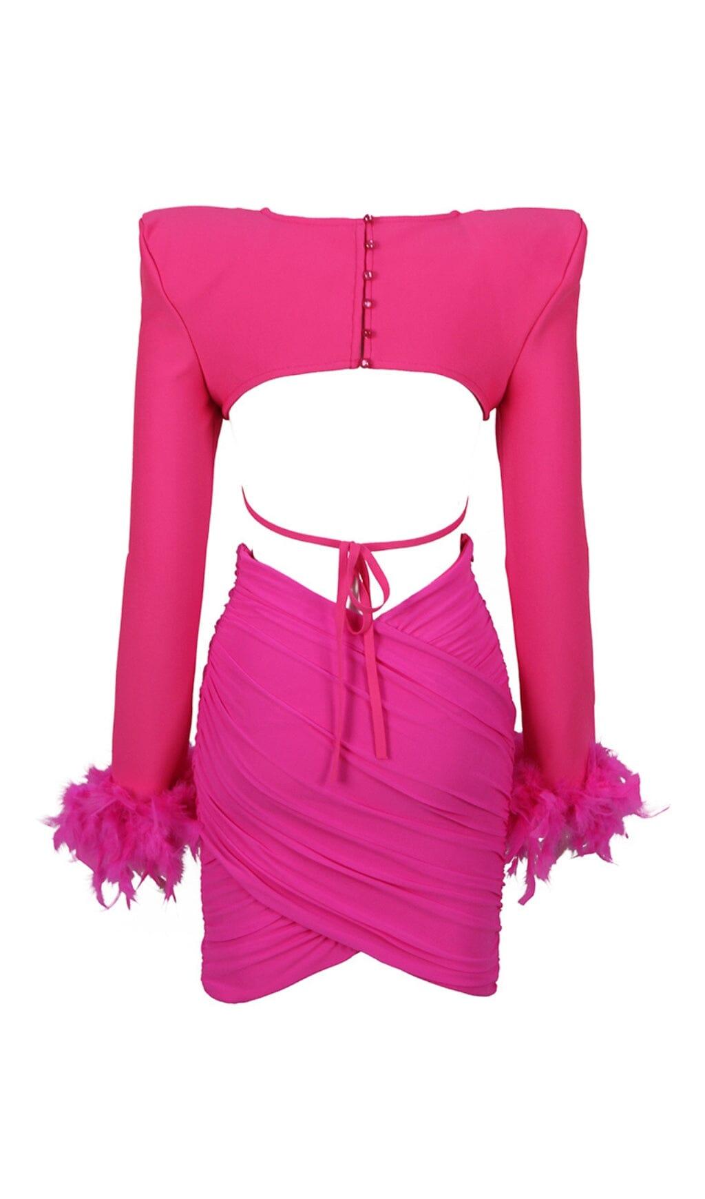 SHOULEDR PAD WAIST BARING FEATHER BLOUSE PLEATED DRESS IN PINK