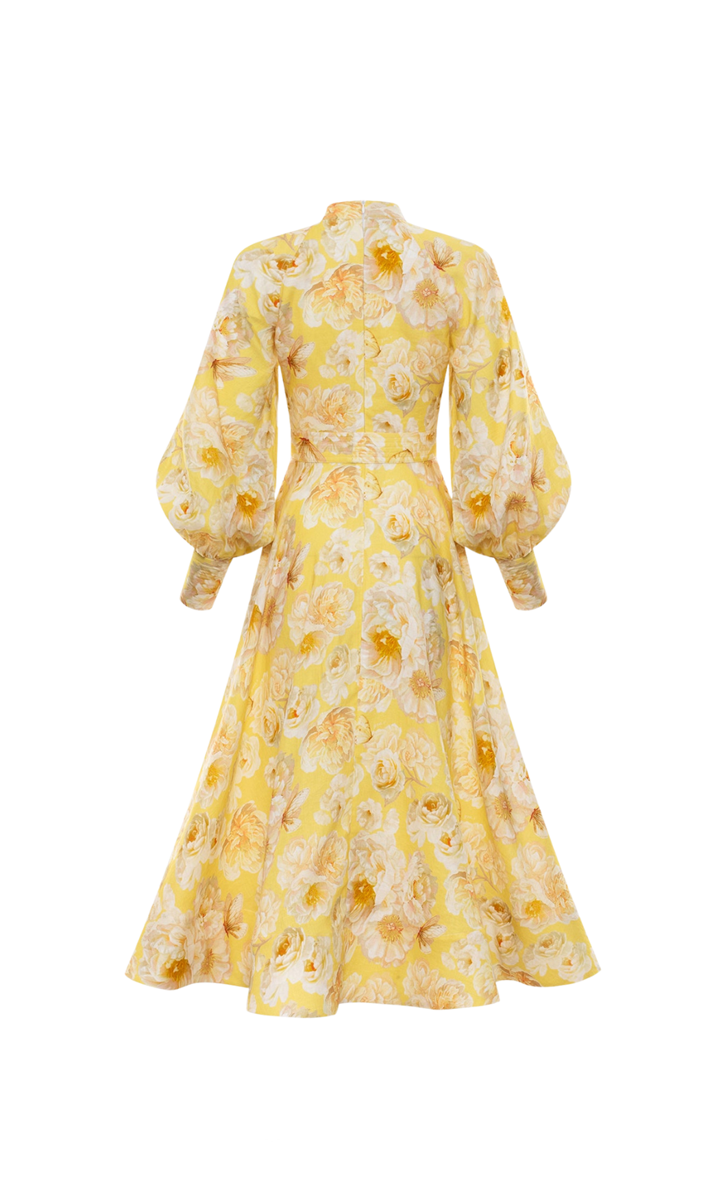 SIGRID YELLOW BUTTERCUP JASMINE LANTERN SLEEVE MIDI DRESS