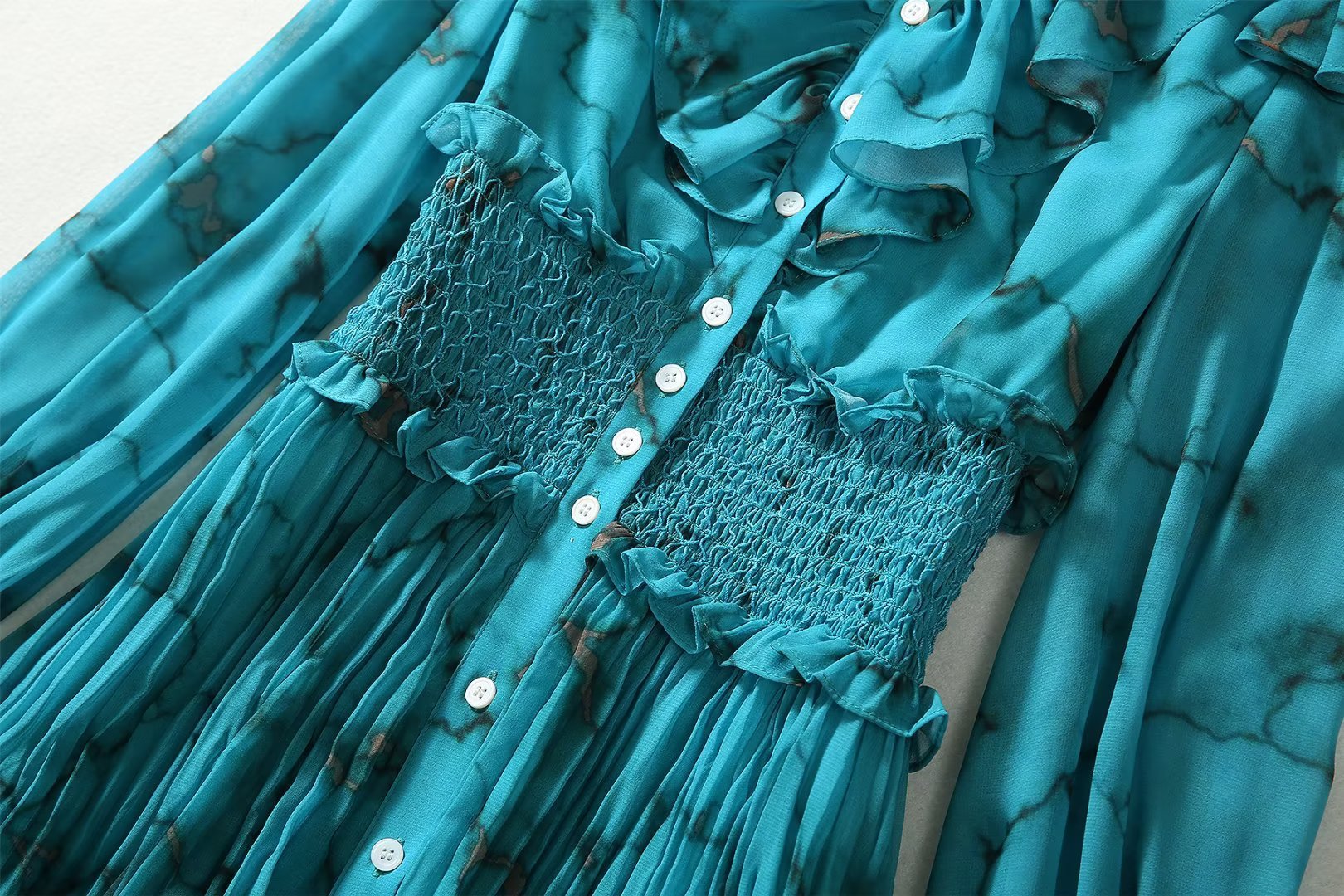 Teal Ruffle Maxi Dress is beautifully detailed with a beautiful floral print through the flowing maxi skirt. It's crafted from comfortable chiffon fabric and decorated with a ruffle on the waist and sleeves for a splendid look. Style the dress with Lace-Up silver heels. Elevate your style quotient with the stunning maxi Dress, perfect for special occasions.