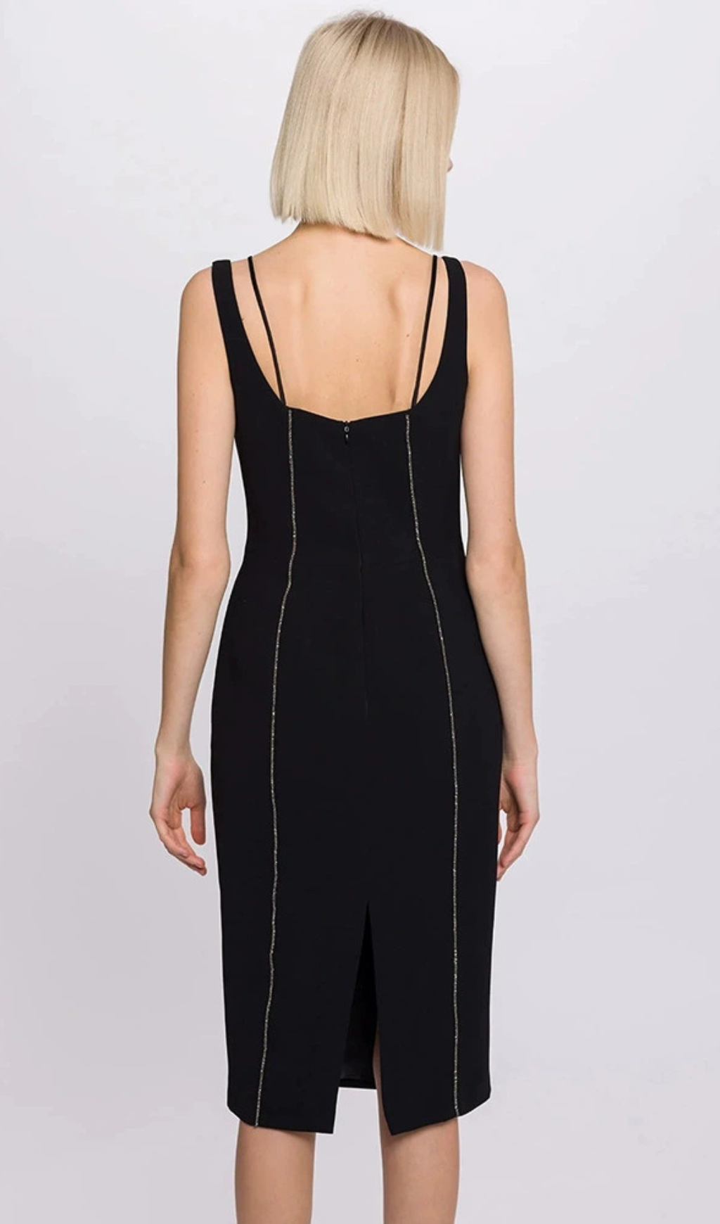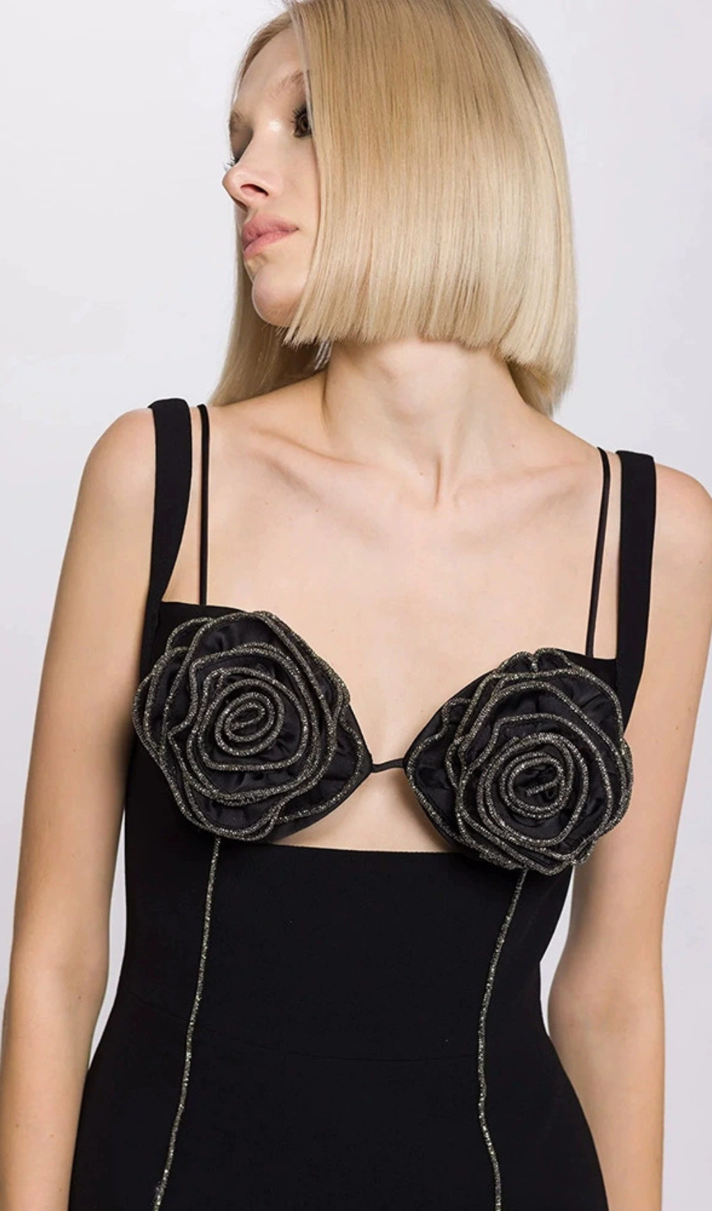 SILVER TRIM FLORAL BUSTIER MIDI DRESS IN BLACK