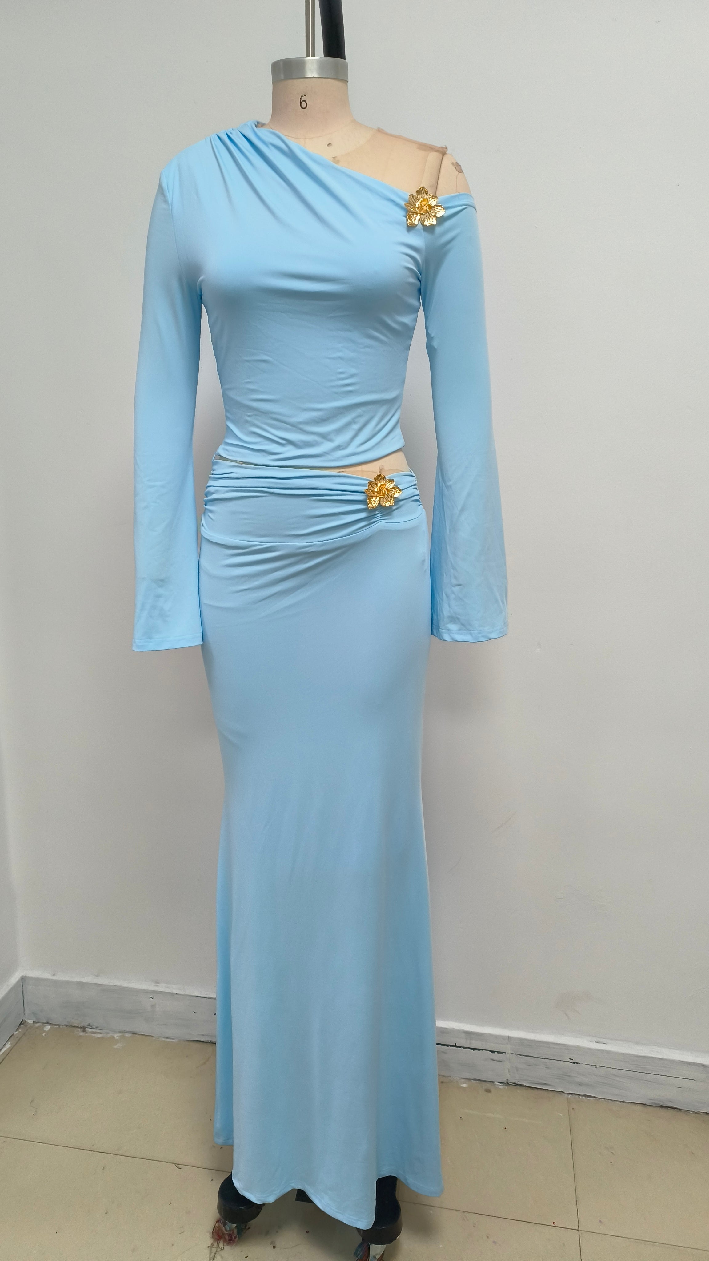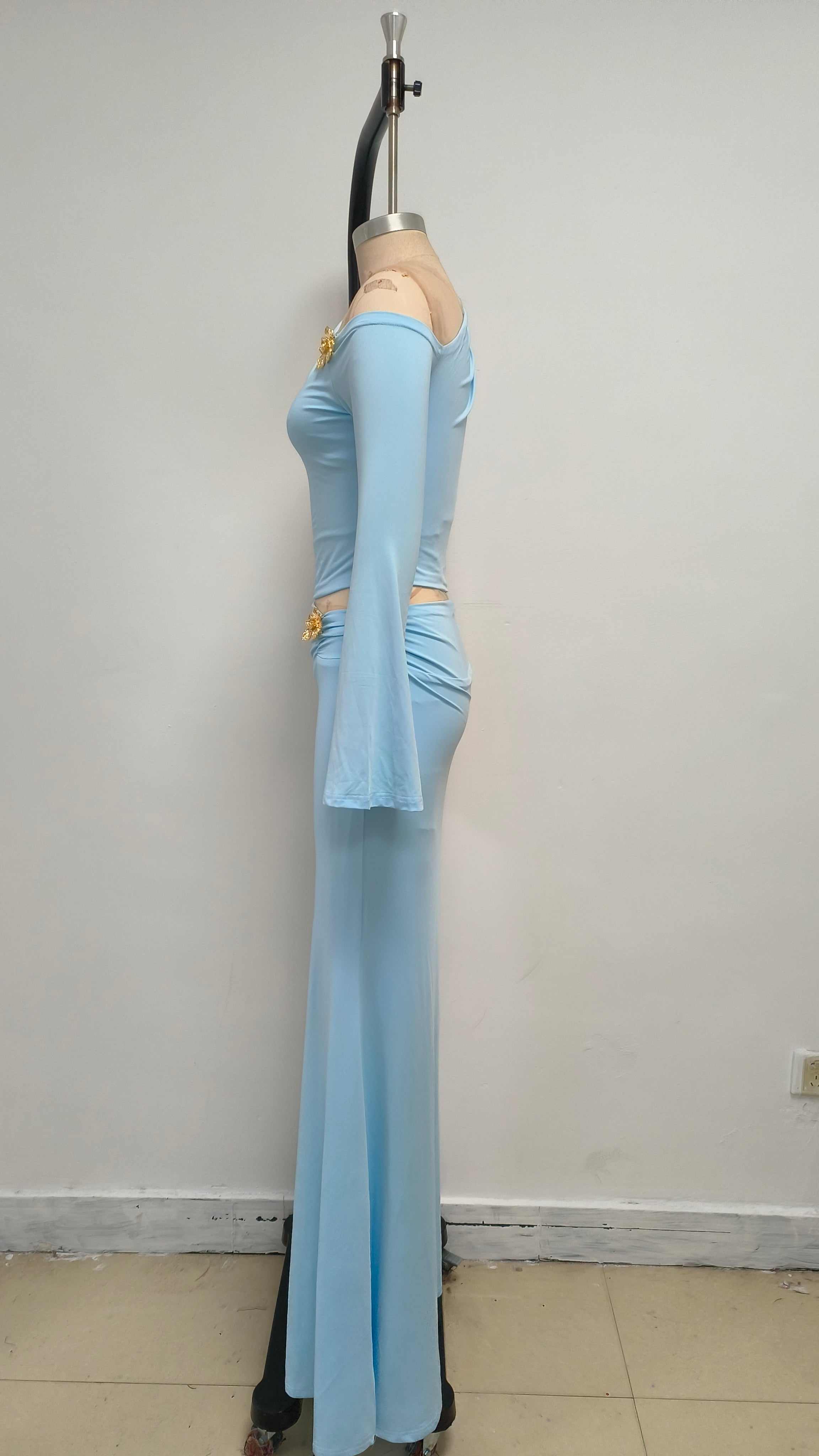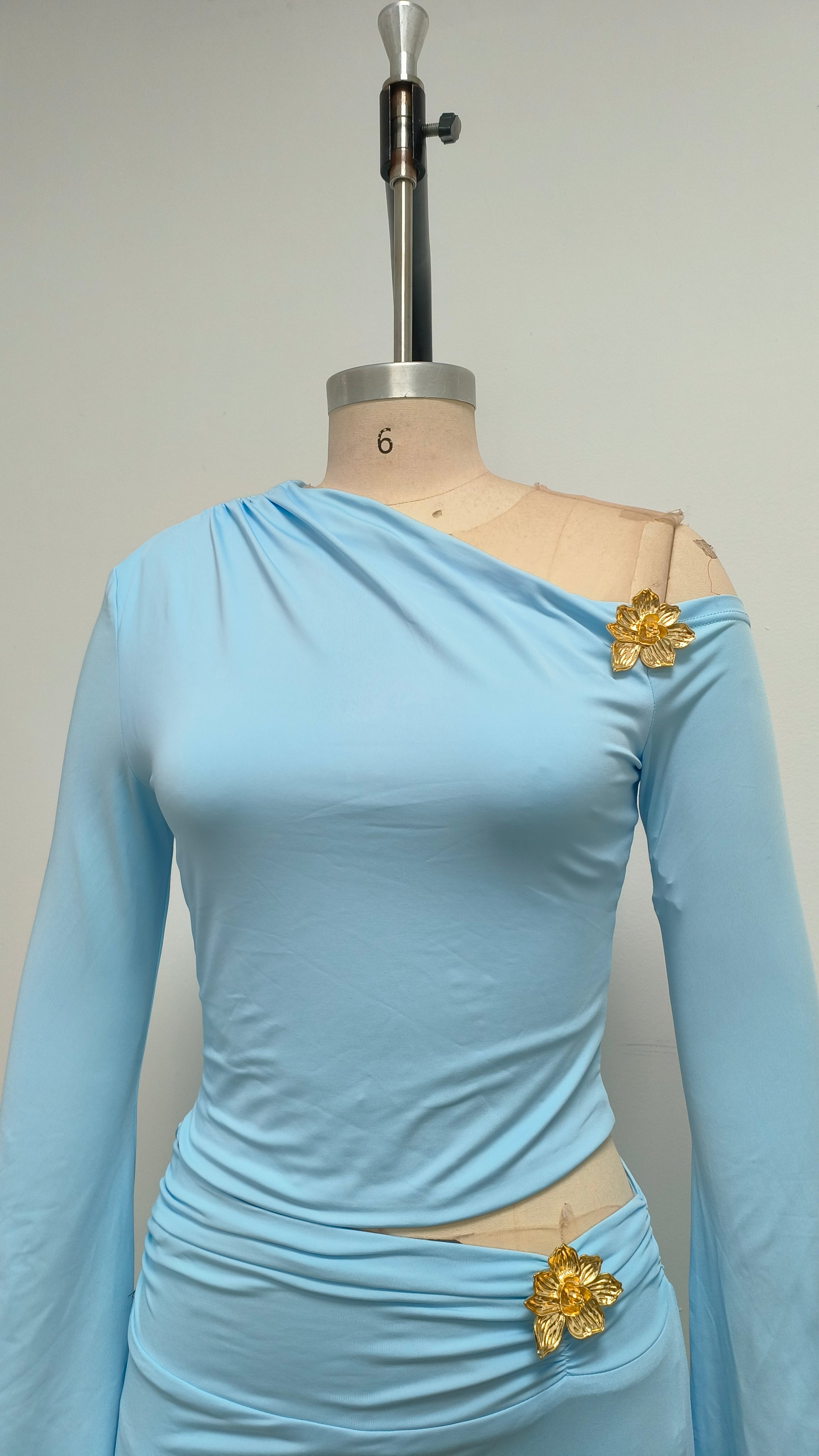 The top is a one - shoulder style, with one shoulder bare, exuding an elegant and sexy charm. The long sleeves are in a flared - sleeve design, adding a vintage touch. The surface of the top has a ruched design, which enhances the three - dimensional effect and accentuates the body curves. The shoulder is adorned with a golden floral ornament, which is gorgeous and eye - catching.